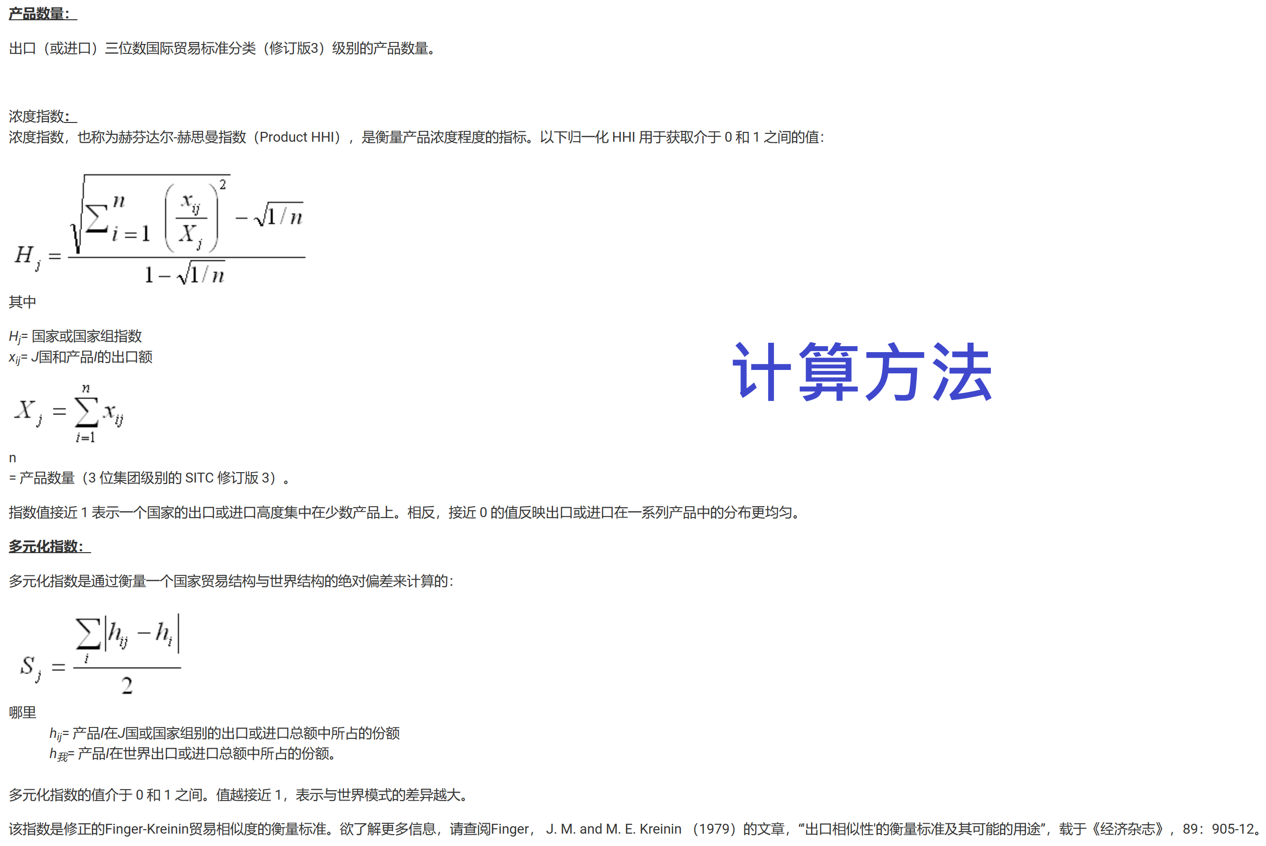 多元化指数:通过衡量一个国家贸易结构与世界结构的绝对偏差来计算的。多元化指数的值介于 0 和 1 之间。值越接近 1,表示与世界模式的差异越大。该指数是修正的Finger-Kreinin贸易相似度的衡量标准。