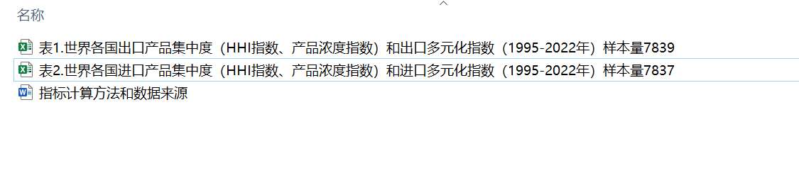 市场集中度指数:即浓度指数,也称为赫芬达尔-赫思曼指数(Product HHI),是衡量产品浓度程度或集中度的指标。指数值接近 1 表示一个国家的出口或进口高度集中在少数产品上。相反,接近 0 的值反映出口或进口在一系列产品中的分布更均匀。