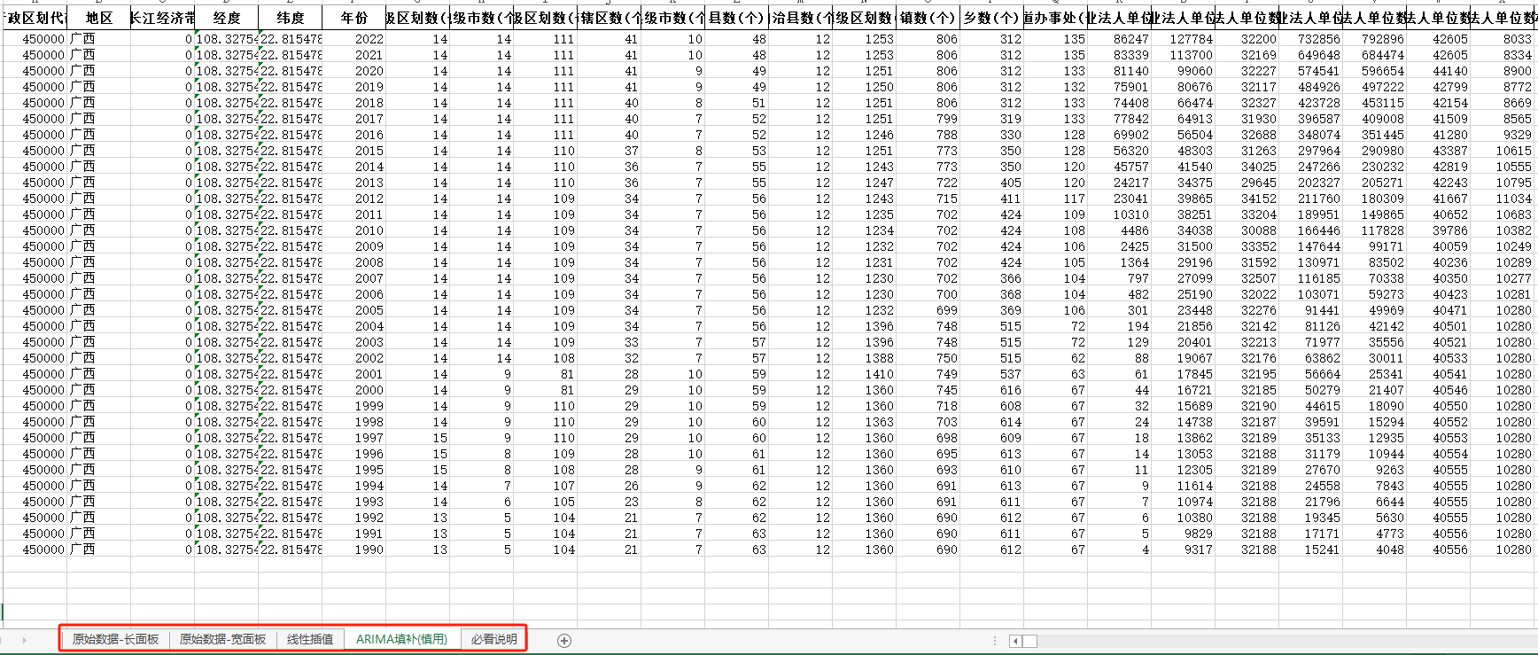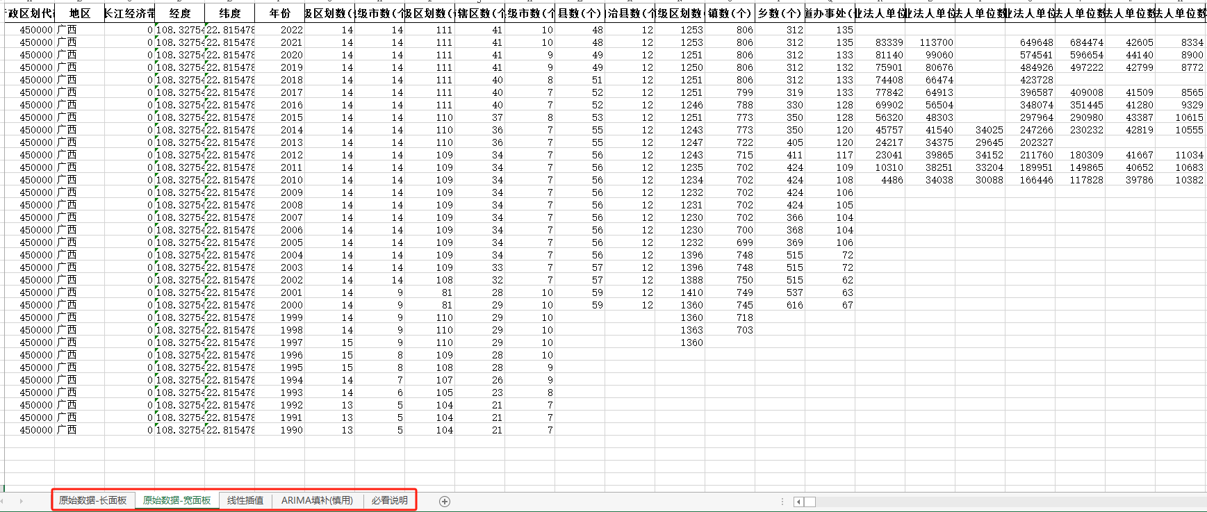 数据年度1990-2022年广西省中国统计年鉴面板数据长面板+宽面板含指标说明ARIMA填补无缺失