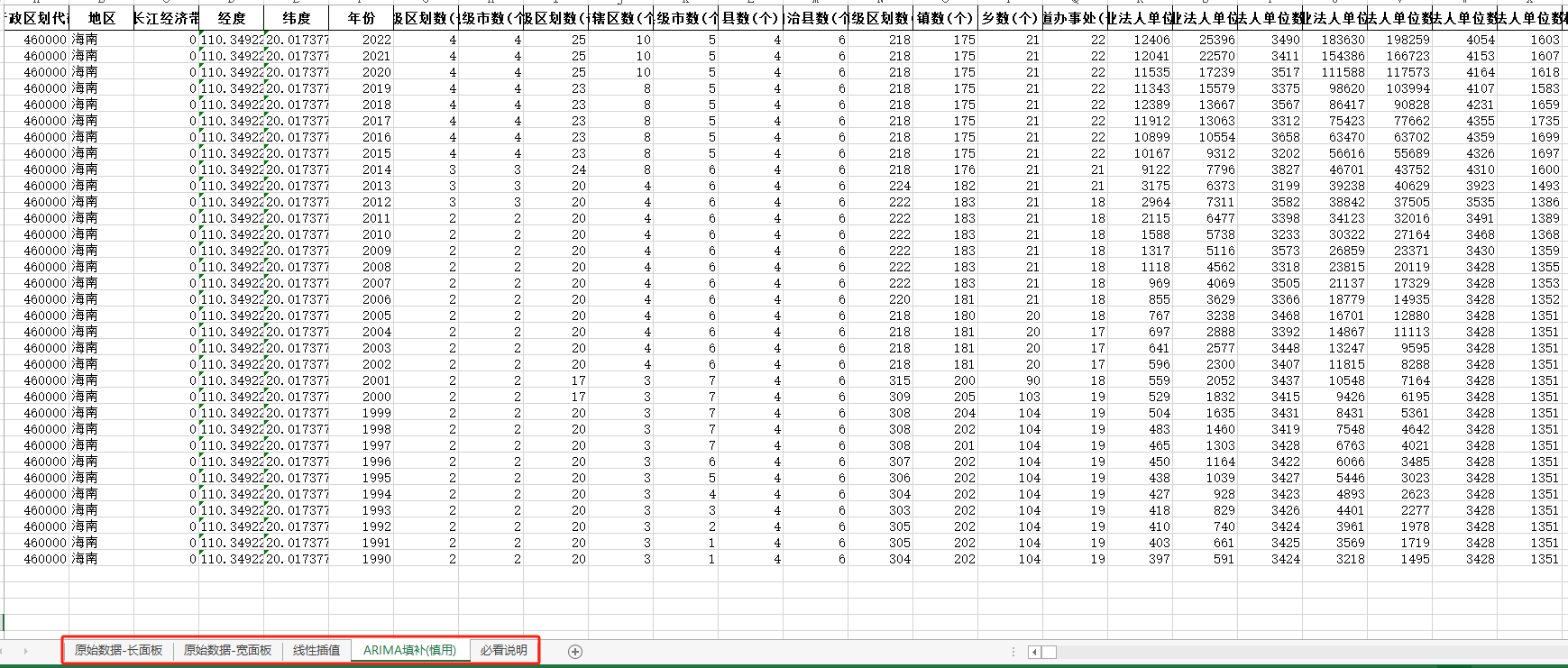 中国省级面板统计数据库(包含四个页签:原始数据-长面板、原始数据-宽面板、线性插值、ARIMA填补四个页签)