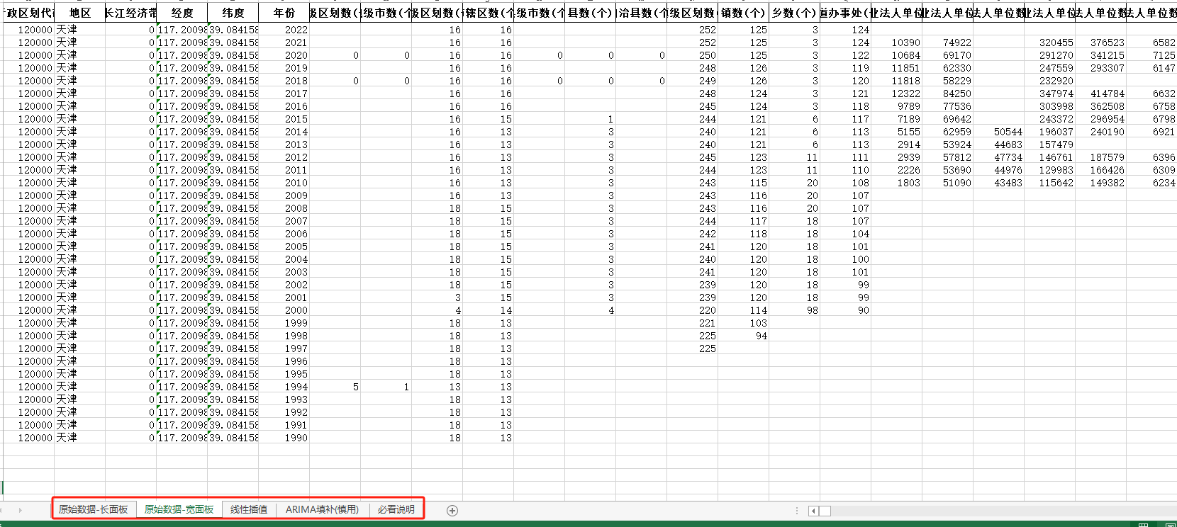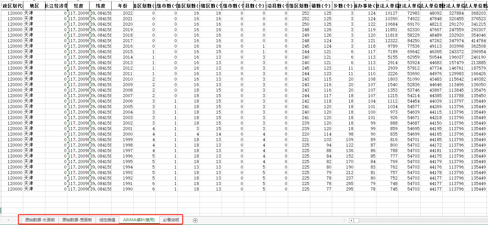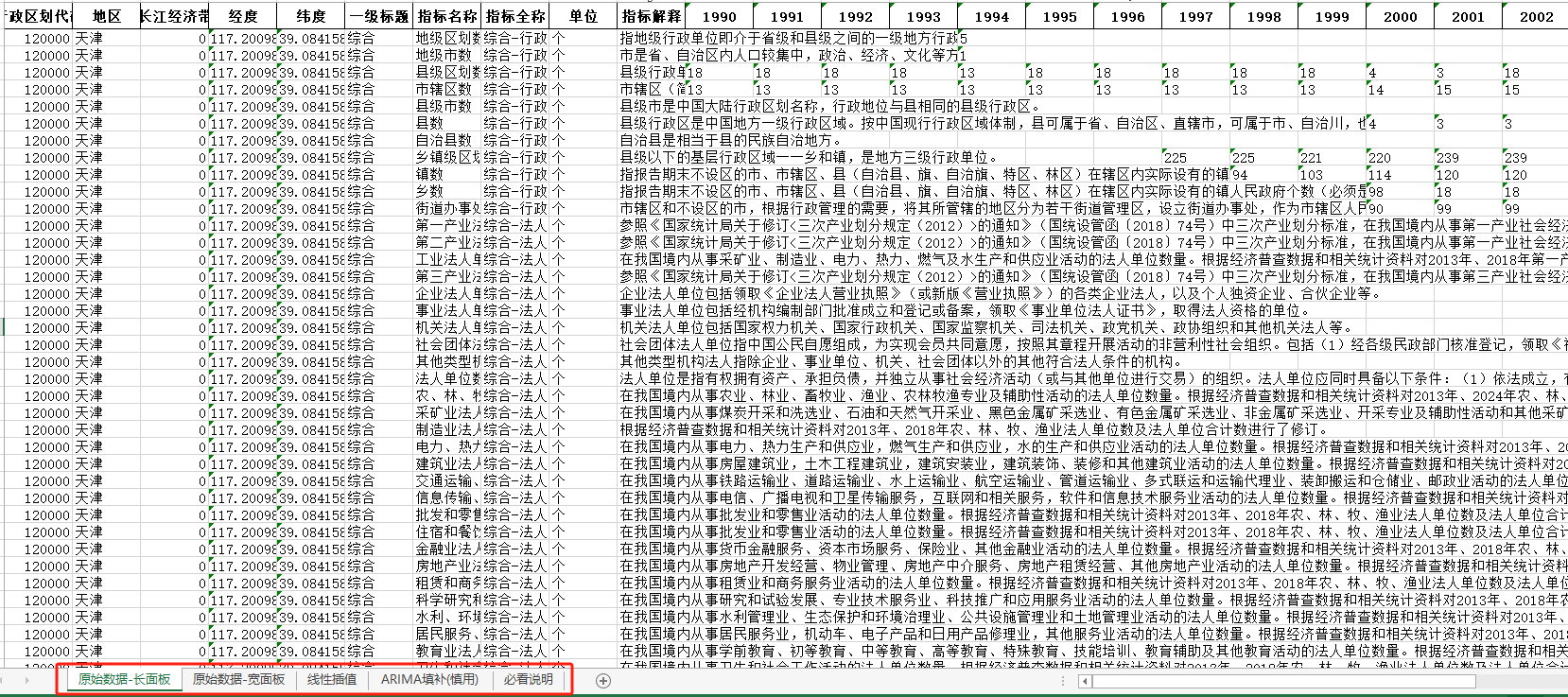 1990-2022年天津市中国统计年鉴面板数据长面板+宽面板含指标说明ARIMA填补无缺失