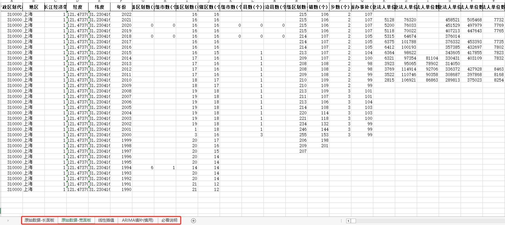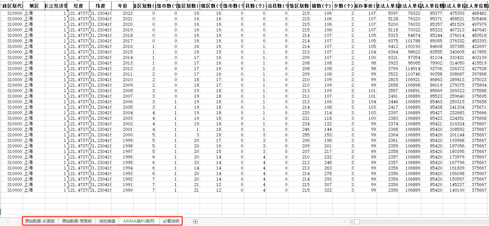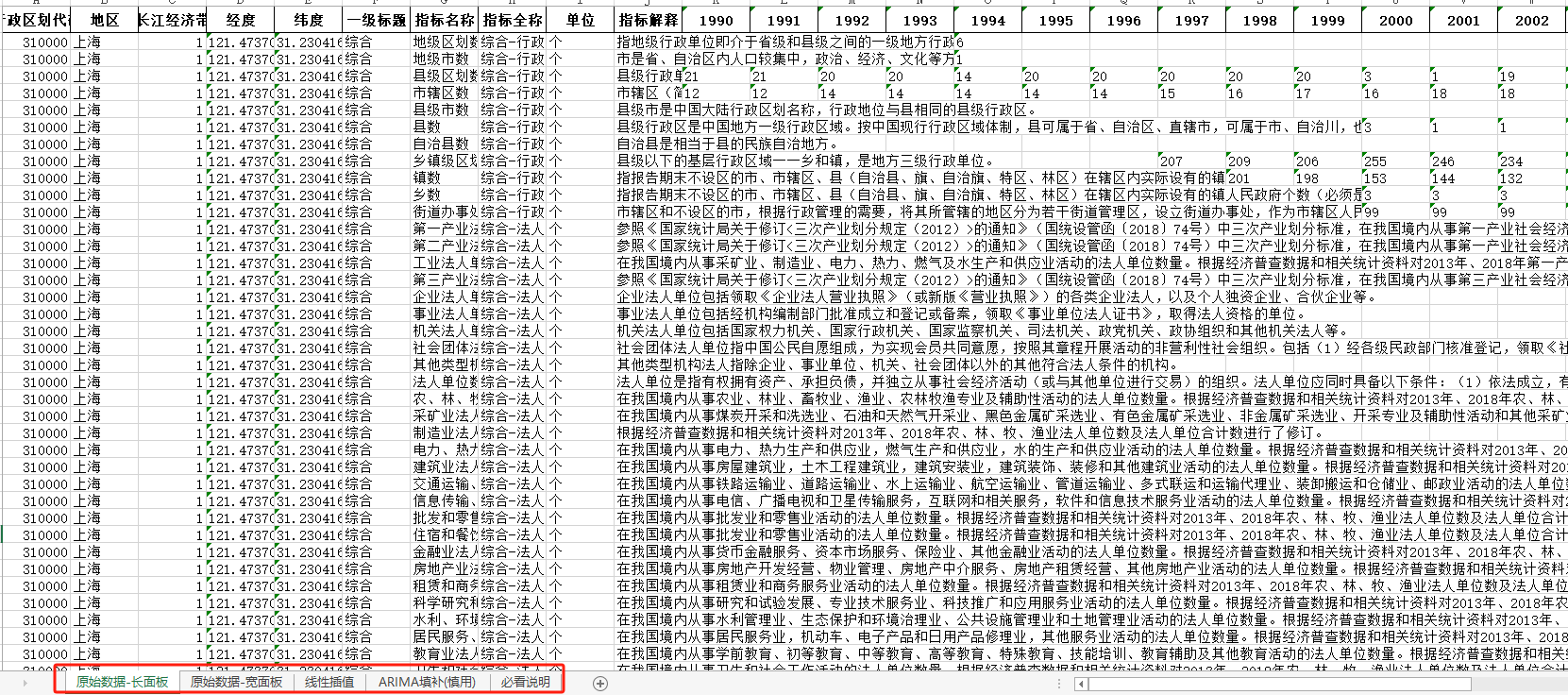 1990-2022年上海市中国统计年鉴面板数据长面板+宽面板含指标说明ARIMA填补无缺失
