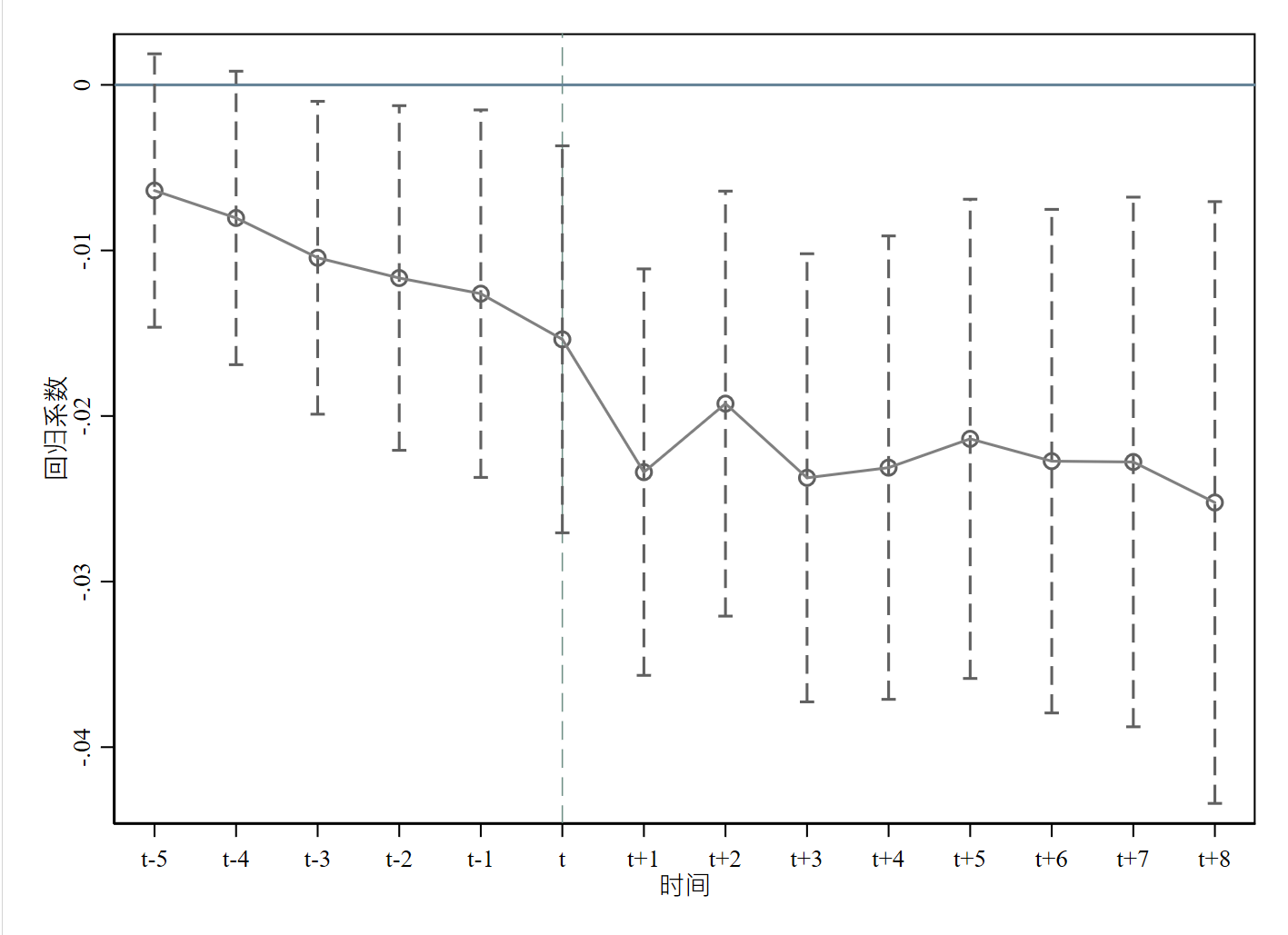 平行趋势检验通没通过友友们 t期之前有些都在0之下,是不是要调下呀?