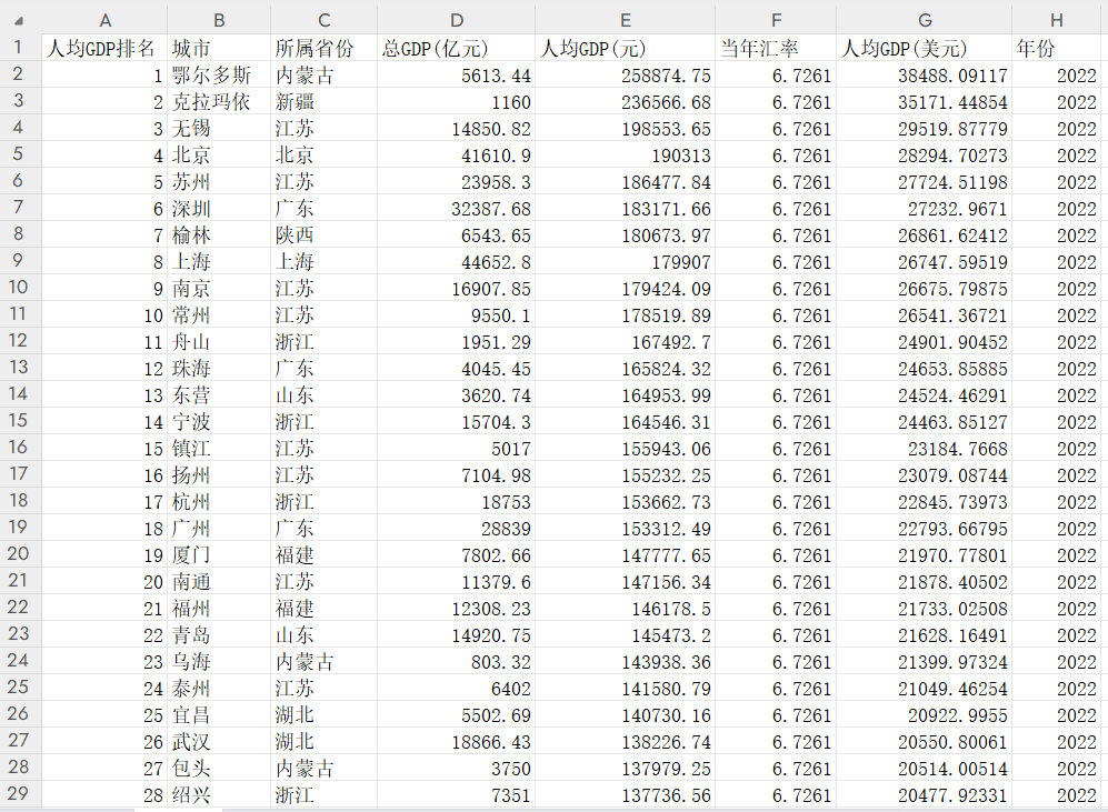 本人整理了291个地级及以上城市的2022年人均GDP数据,以美元单位,将人均GDP达到2万美元作为进入发达国家的门槛,并统计达到门槛的城市名单