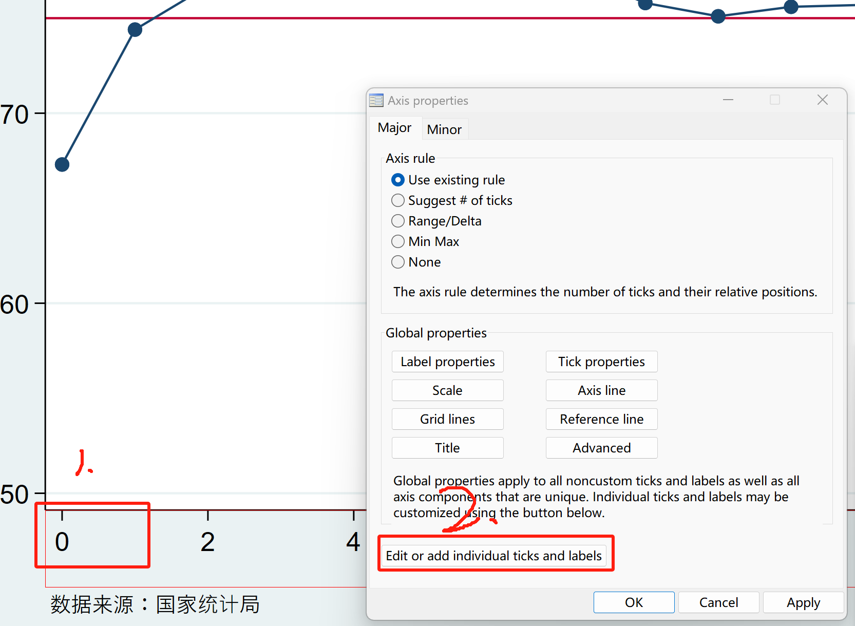 xscale(range(0 12)) xlabel(0(2)12) yscale(range(50 80)) ylabel(50 60 70 80, angle(horizontal)) ///