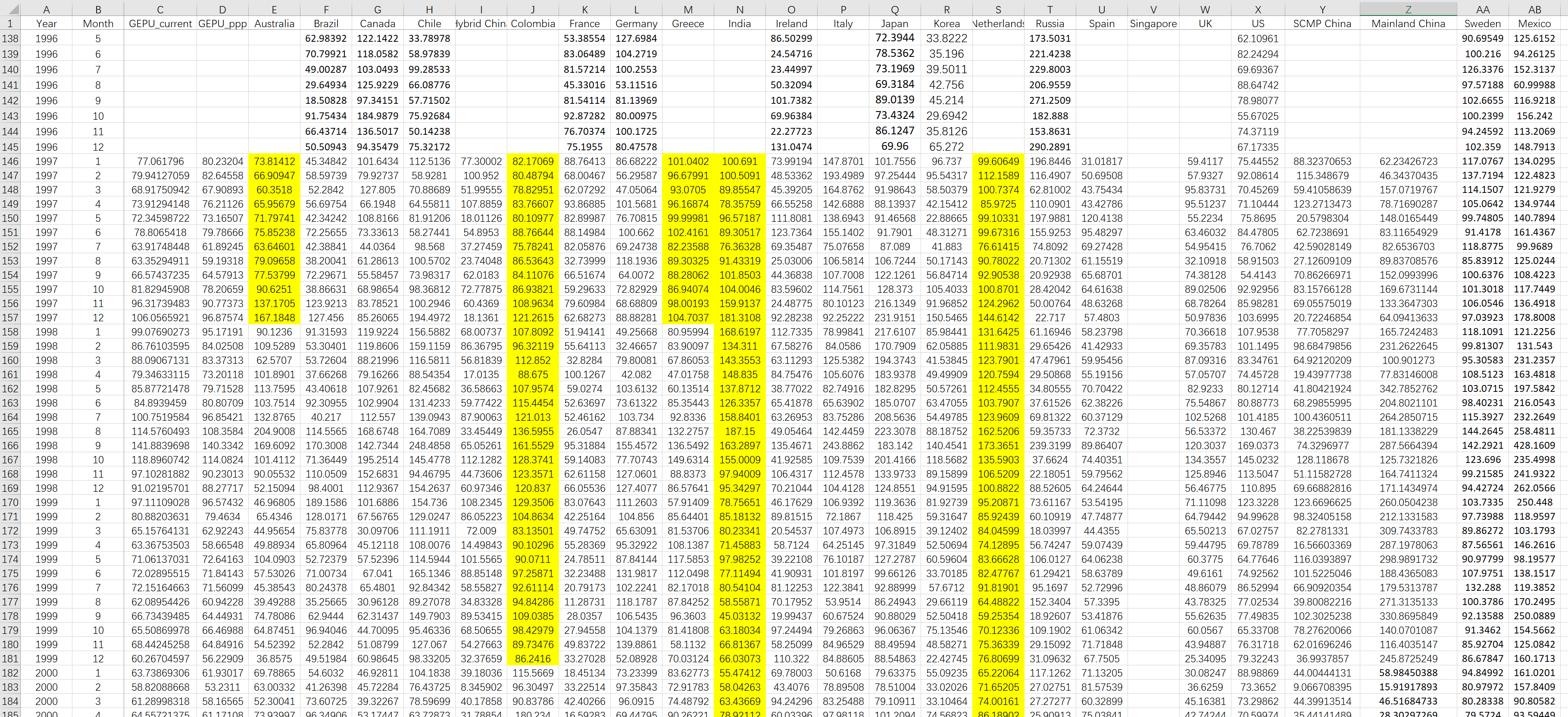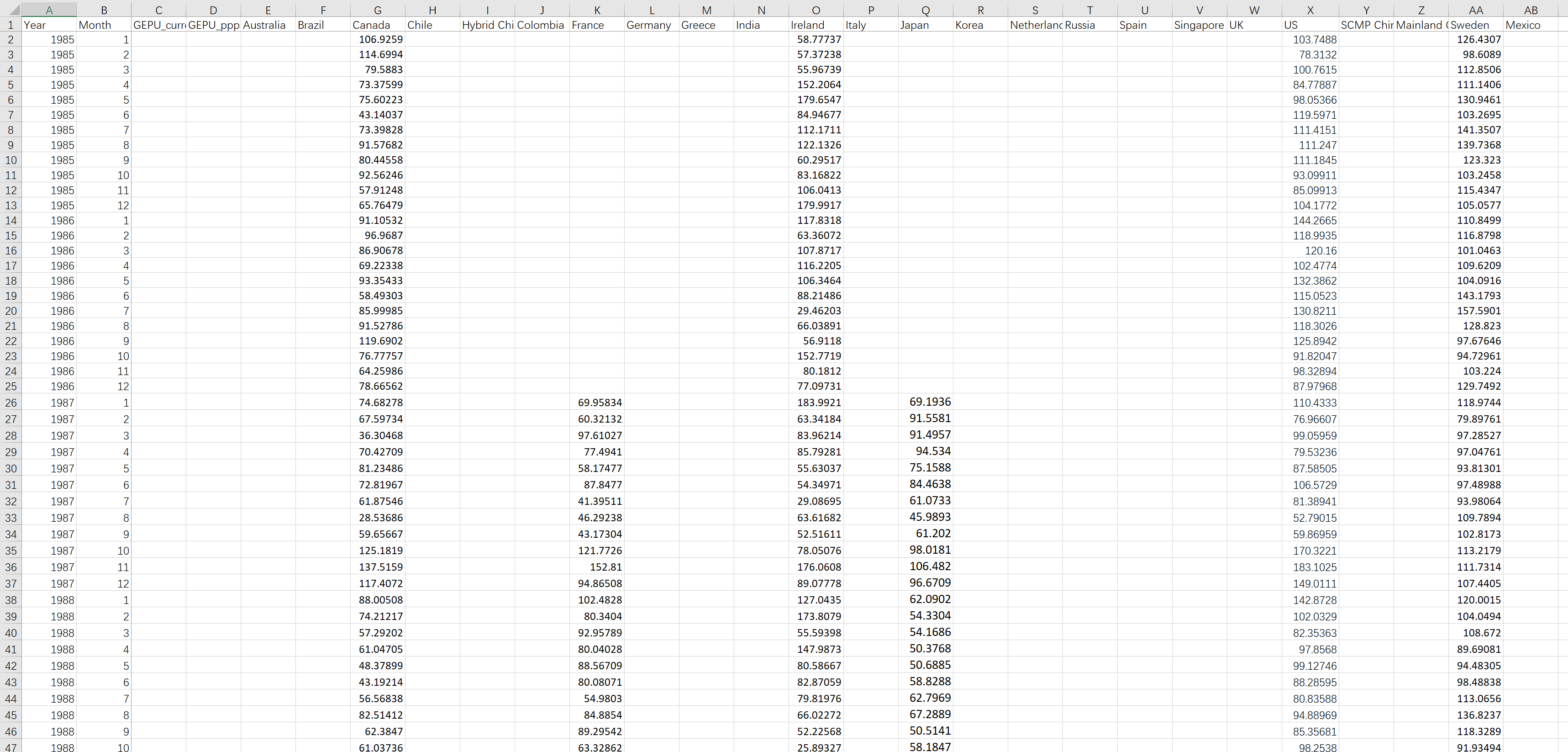 包含22个国家的月度经济政策不确定性指数EPU,以及两个全球经济政策不确定性的GDP加权指数。1985.01-2023.12,最新数据!!