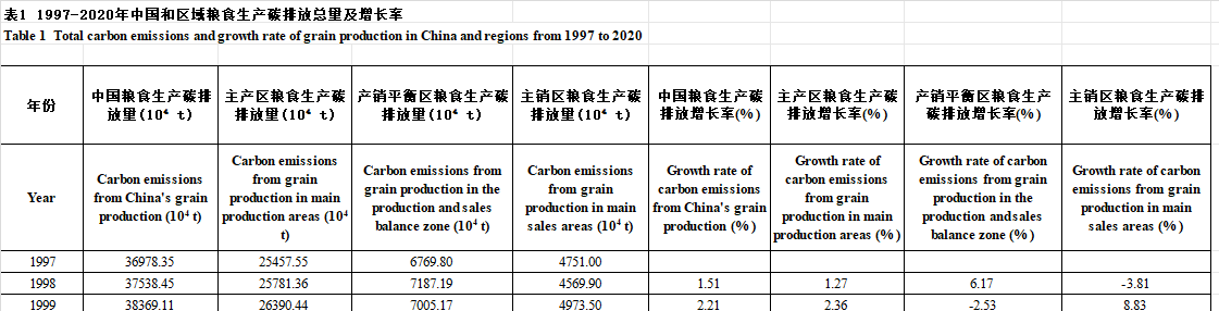 表1 1997-2020年中国和区域粮食生产碳排放总量及增长率