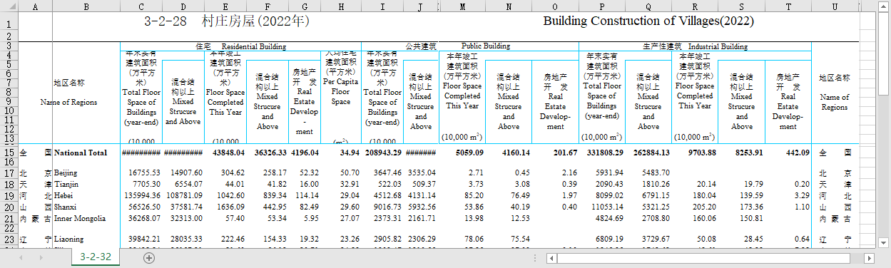 全国32个省份村庄房屋2007-2022人均住宅建筑面积公共生产性建筑混凝土结构房地产开发本年新增竣工面积