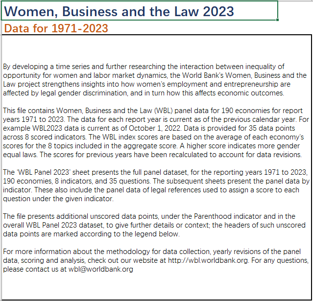 Women, Business and the Law(WBL)项目由世界银行开发,通过分析时间序列数据,研究女性机会不平等与劳动市场动态之间的关系。该项目提供了1971年至2023年的190个经济体的面板数据,包括8个评分指标和35个数据点。