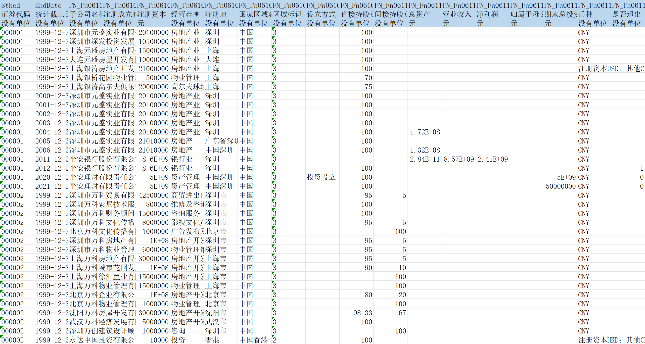 相关数据:证券代码、年份、证券简称、控股子公司数量、子公司数量加1的自然对数、子公司数量加1的自然对数并经过行业平均数调整、应收账款除以资产总额、(年末应收账款+存货)/年末总资产、资产负债表日至审计报告披露日间隔的自然对数、行业名称、行业代码、制造业取两位代码,其他行业用大类等等