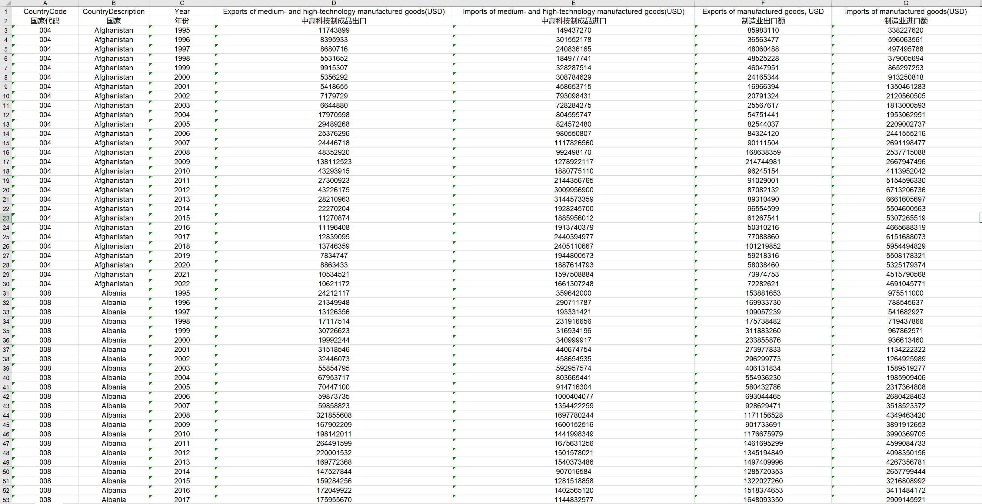 世界各国中高科技制成品进出口/制造业进出口1995-2022数据,整理好的面板数据可以直接使用,样本量5852!