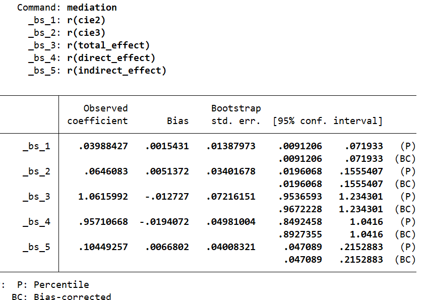 bootstrap r(cie2) r(cie3) r(total_effect) r(direct_effect) r(indirect_effect) , reps(20) : mediation
