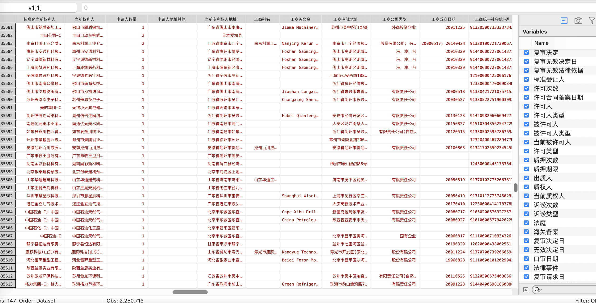 专利转让数据追踪和记录专利从一个实体转移到另一个实体的过程。这些数据不仅包括参与转让的申请人和受让人的身份信息,如名字和地址,还涵盖了转让的具体法律细节,包括转让执行日、转让次数、法律状态变更,以及转让登记的相关信息。此外,这些数据通常还会包含每项专利的基本信息,如公开号码、申请日期、专利标题和摘要,以及专利的分类号。这样的数据对于分析知识产权趋势、评估企业资产和制定商业战略具有一定的参考价值。