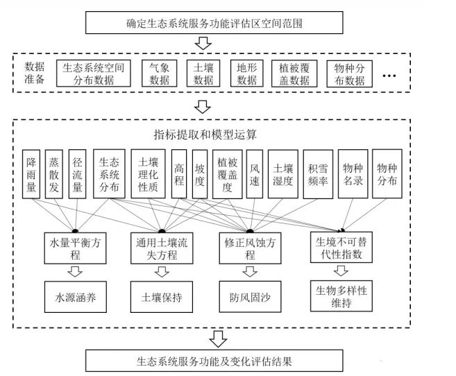 防风固沙是生态系统(如森林、草地等)通过其结构与过程减少由于风蚀所导致的土壤侵蚀的作用,是生态系统提供的重要调节服务之一。防风固沙功能主要与风速、降雨、温度、土壤、地形和植被等因素密切相关。以防风固沙量(潜在风蚀量与实际风蚀量的差值)作为生态系统防风固沙功能的评估指标。
