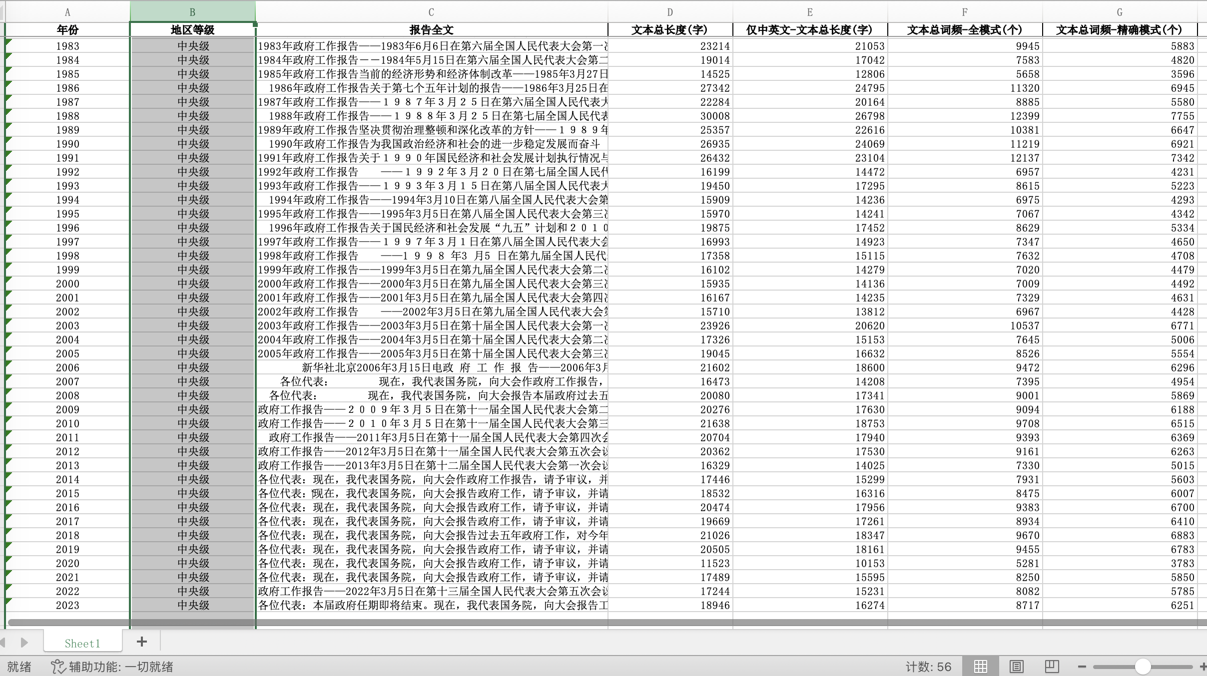 1954-2023年中国全国中央政府工作报告各省级地级市政府工作报告原文-Excel文本长度词频总数