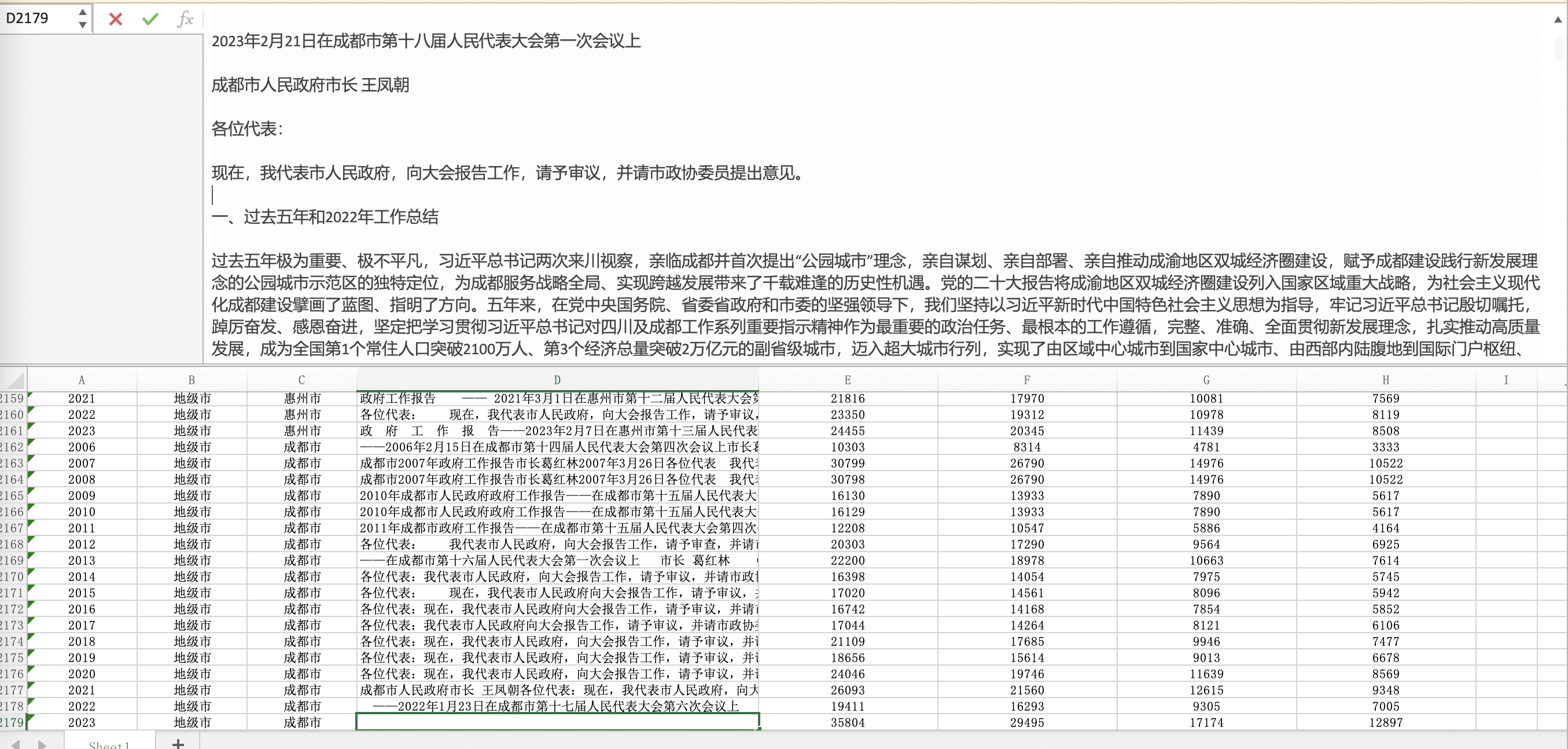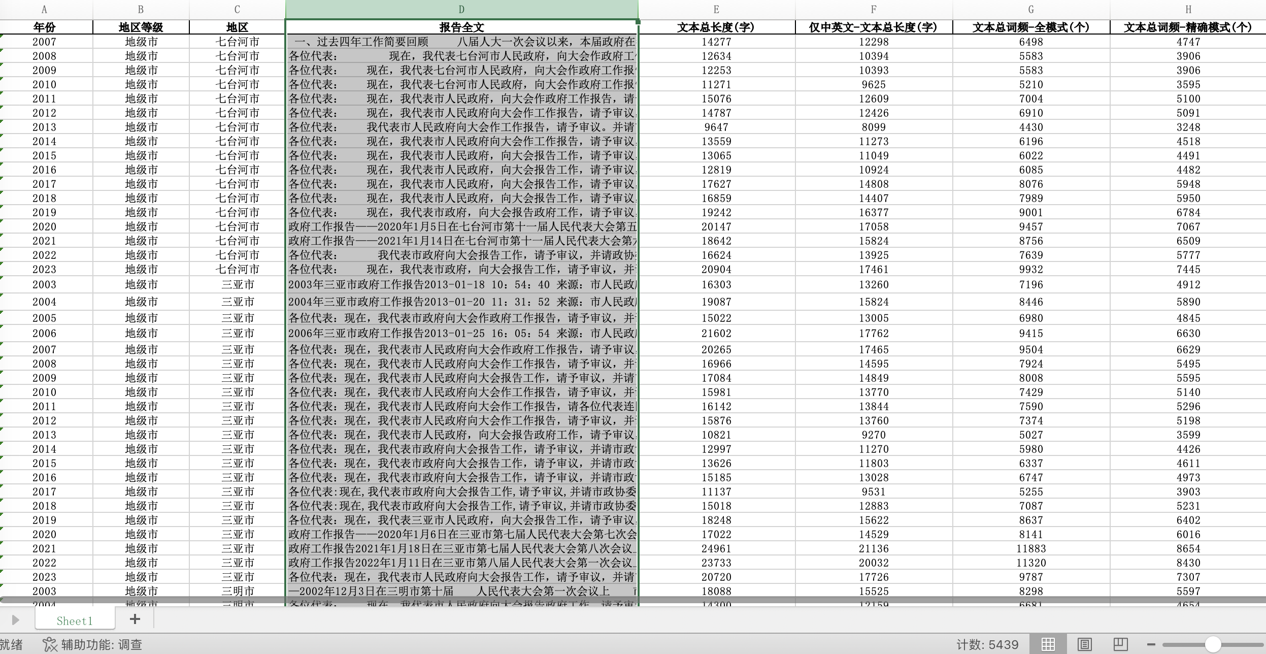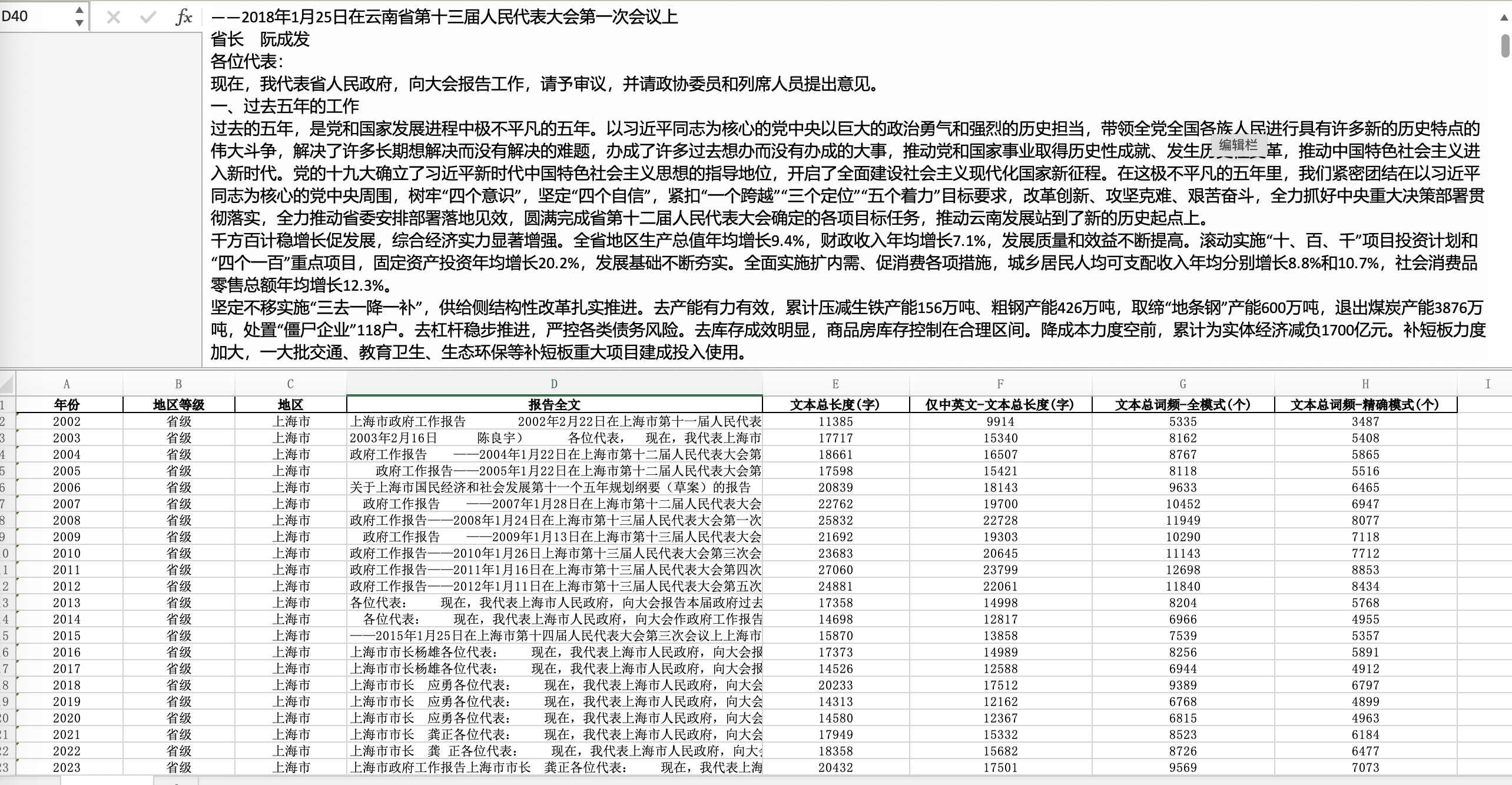 数据名称:中国全国中央政府工作报告各省级地级市政府工作报告原文-Excel文本长度词频总数