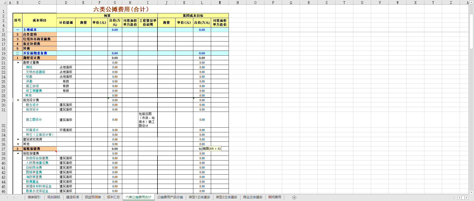 | 14 | 对于集团的一级土地开发业务,本表也基本适用。可以将一级开发业务的每批可售土地作为“某类产品”进行核算。发生的土地整理费用(包括土地获得价、开发前期准备费、区域管网工程费、园林环境费、配套设施费、开发间接费)基本上应全部列为需要分摊的公摊费用。至于是在地块的占地面积还是按地块的容积率为基础进行分摊,可以根据实际情况决定,只需更改本套表中的自动设置的公式即可。 |