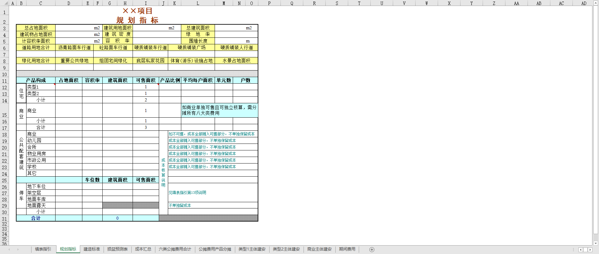 | 6 | 本表为一套测算报表,子公司只需要填写《规划指标》、《建造标准》、《期间费用表》、《类型1主体建安》、《类型2主体建安》、《商业主体建安》、《六类公摊费用合计》。在填写时请按上述给出的顺序分别填列。 |