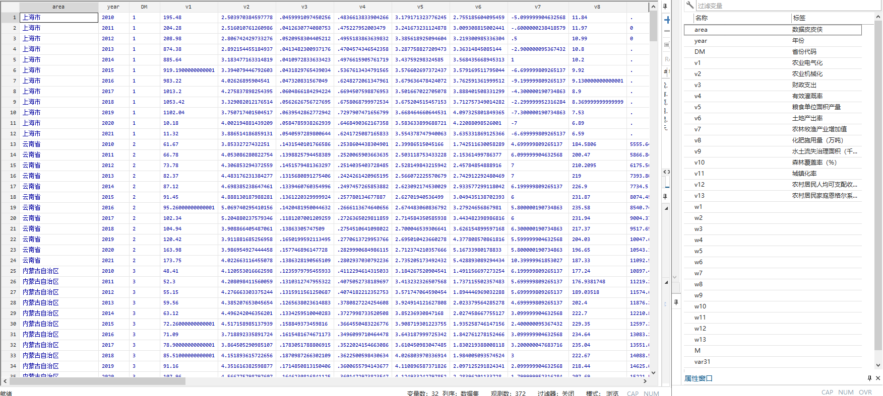 数据年份 省份代码 农业电气化 农业机械化 财政支出 有效灌溉率 粮食单位面积产量 土地产出率 农林牧渔产业增加值 化肥施用量(万吨) 水土流失治理面积(千公顷) 森林覆盖率(%) 城镇化率 农村居民人均可支配收入(元) 农村居民家庭恩格尔系数(%) w1 w2 w3 w4 w5 w6 w7 w8 w9 w10 w11 w12 w13 M var31 var32