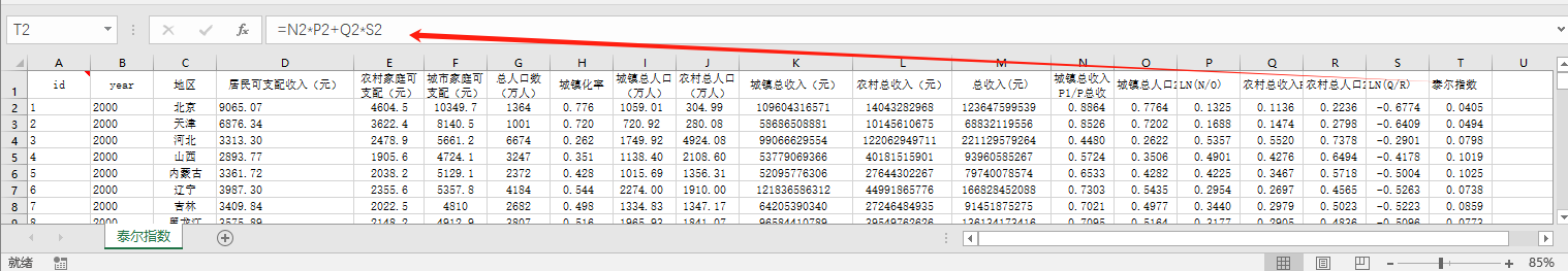 id year 地区 居民可支配收入(元) 农村家庭可支配(元) 城市家庭可支配(元) 总人口数(万人) 城镇化率 城镇总人口(万人) 农村总人口(万人) 城镇总收入(元) 农村总收入(元) 总收入(元) 城镇总收入P1/P总收入 城镇总人口Z1/Z总人口 LN(N/O) 农村总收入P2/P总收入 农村总人口Z2/Z总人口 LN(Q/R) 泰尔指数