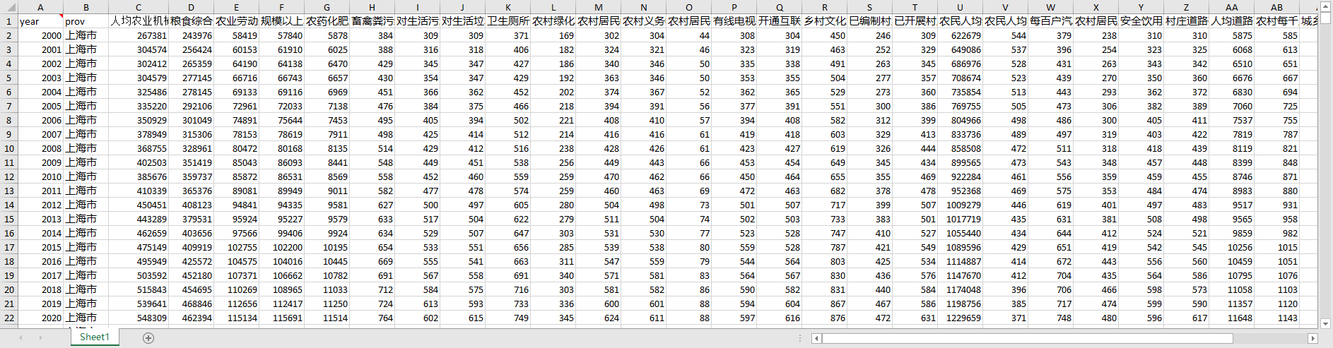 省份 地区 年份 乡村振兴指数 人均农业机械总动力(千瓦) 粮食综合生产能力(万吨) 农业劳动生产率(元/人) 规模以上农产品加工企业主营业务收入(亿元) 农药、化肥施用量(万吨) 畜禽粪污综合利用率(%) 对生活污水进行处理的行政村占比(%) 对生活垃圾进行处理的行政村占比(%) 卫生厕所普及率(%) 农村绿化率(%) 农村居民教育文化娱乐支出占比(%) 农村义务教育学校专任教师本科以上学历比例(%) 农村居民平均受教育年限(年) 有线电视覆盖率(%) 开通互联网宽带业务的行政村比重(%) 乡村文化站数量(个) 村主任、书记”一肩挑“比例(%) 巳编制村庄规划的行政村占比(%) 已开展村庄整治的行政村占比(%) 农民人均纯收入(元) 农民人均收入增长率(%) 城乡居民收入比(%) 农村贫困发生率(%) 农村居民恩格尔系数(%) 每百户汽车拥有量(辆) 农村居民人均住房面积(平方米) 安全饮用水普及率(%) 村庄道路硬化率(%) 人均道路面积(平方米) 农村每千人拥有卫生技术人员数(人)