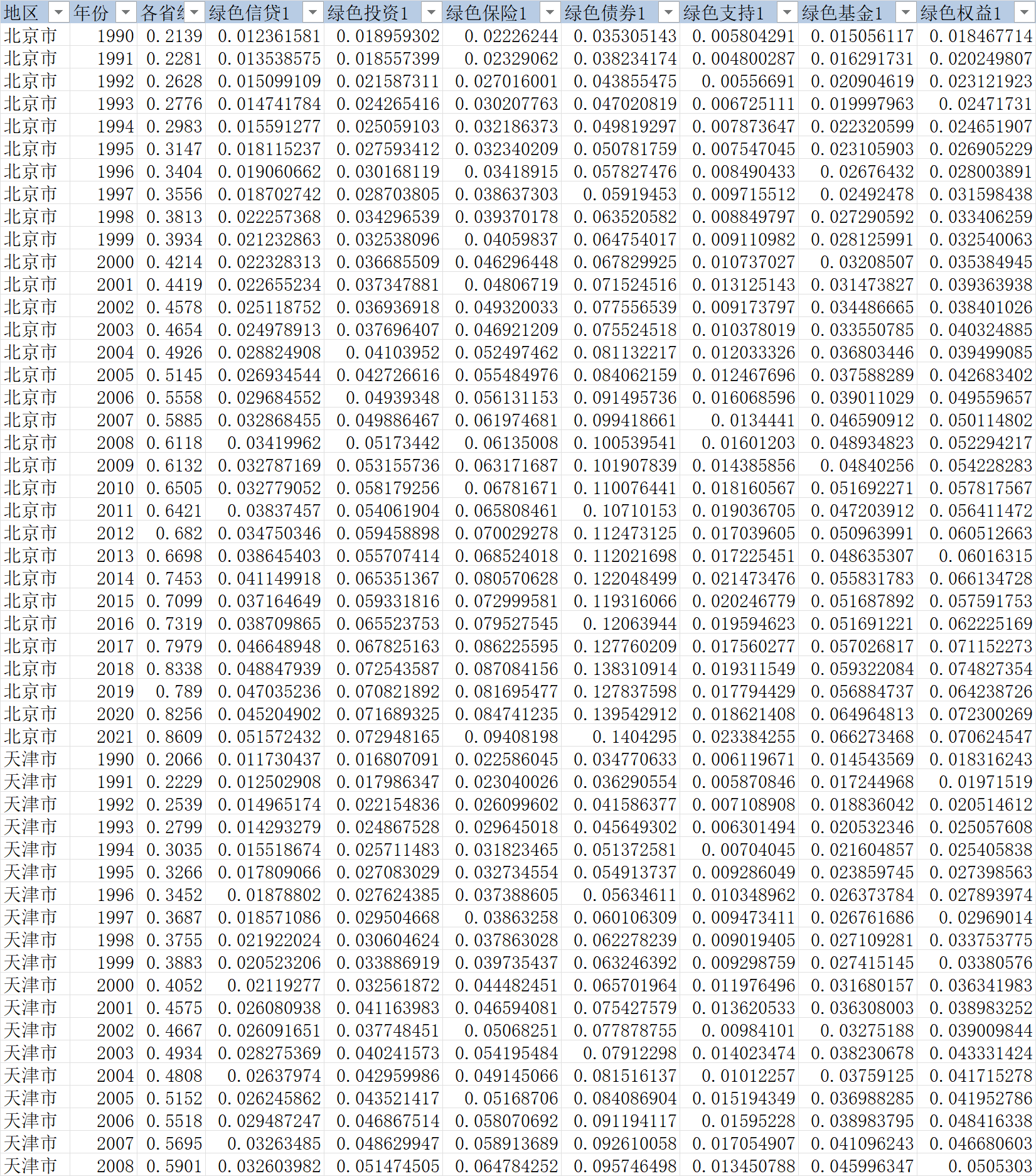 相关数据:地区、年份、各省绿色金融指数、绿色信贷、绿色投资、绿色保险、绿色债券、绿色支持、绿色基金、绿色权益