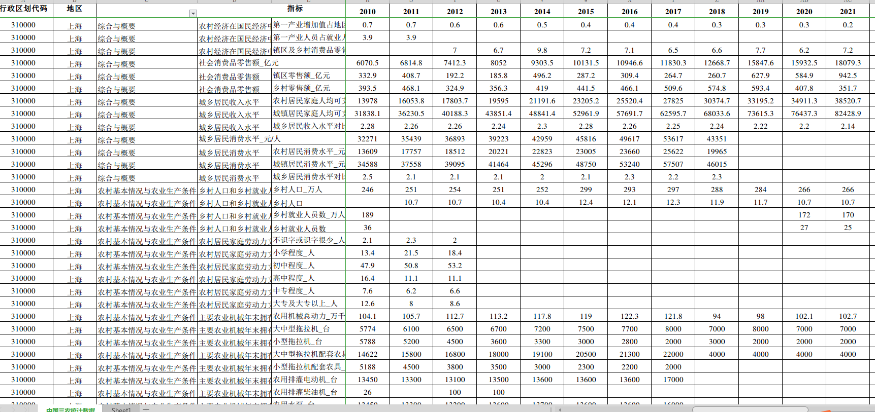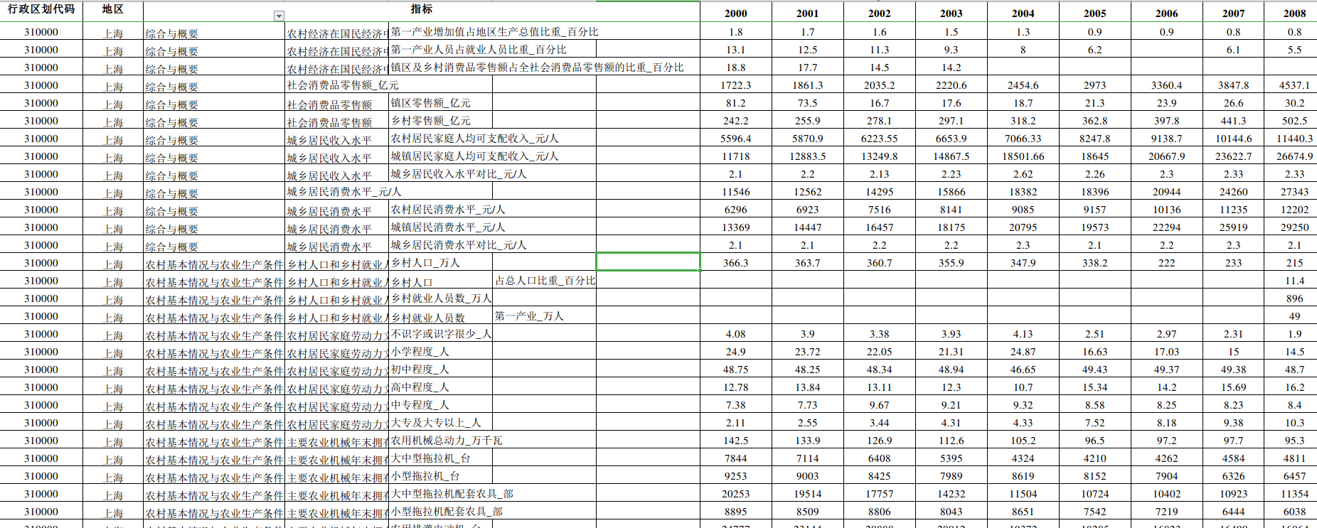 4、指标:、农村经济在国民经济中的地位、社会消费品零售额、社会消费品零售额、城乡居民收入水平、城乡居民消费水平_元/人、城乡居民消费水平、乡村人口和乡村就业人员、农村居民家庭劳动力文化状况平均每百个劳动力中、主要农业机械年末拥有量、农村电力和农田水利建设、农用化肥施用量、农用化肥施用量、农用塑料薄膜使用量、农用塑料薄膜使用量、农用柴油和农药使用量、农村居民家庭年末拥有主要生产性固定资产原值_元/户、农村居民家庭年末拥有主要生产性固定资产原值、耕地面积构成、农用地面积_万公顷、农用地面积、自然保护、农村改水、改厕、农村可再生资源利用、林业重点工程建设_公顷、林业重点工程建设