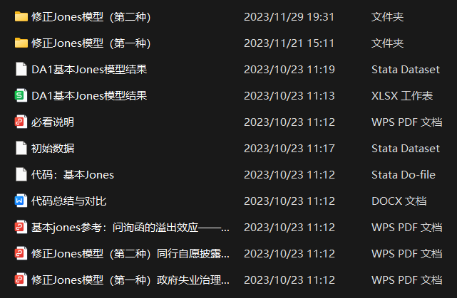 含三个stata代码过程、原始、参考、结果,结果为Dta+Excel文件,具体如下:一个基本Jones模型和两个修正Jones模型均有对应参考(参考均有标注,并针对三个模型代码差异制作了word对比)