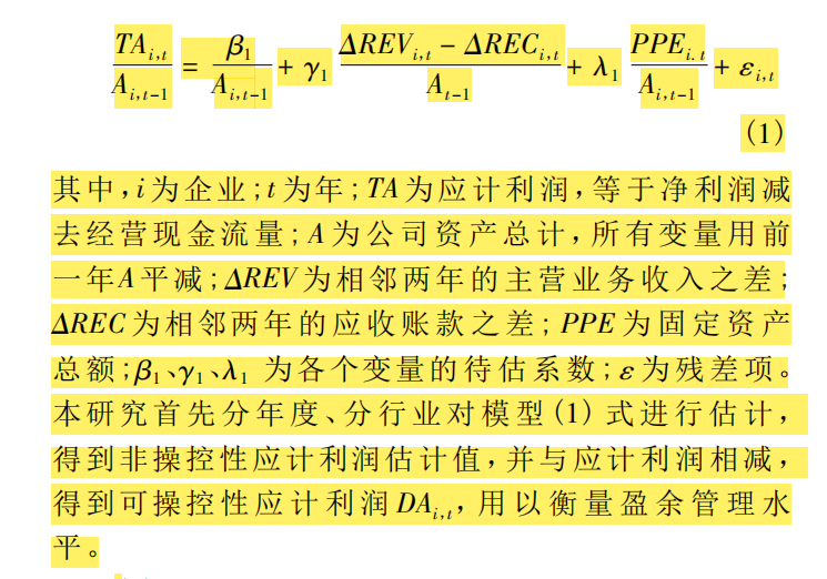 变量说明:TAi,t为总应计利润;Ai,t-1为第t-1期的期末总资产;ΔREVi,t为第t期较第t-1期的主营业务收入变动额;ΔRECi,t为第t期较第t-1期的应收账款变动额;PPEi,t为第t期期末固定资产原值。