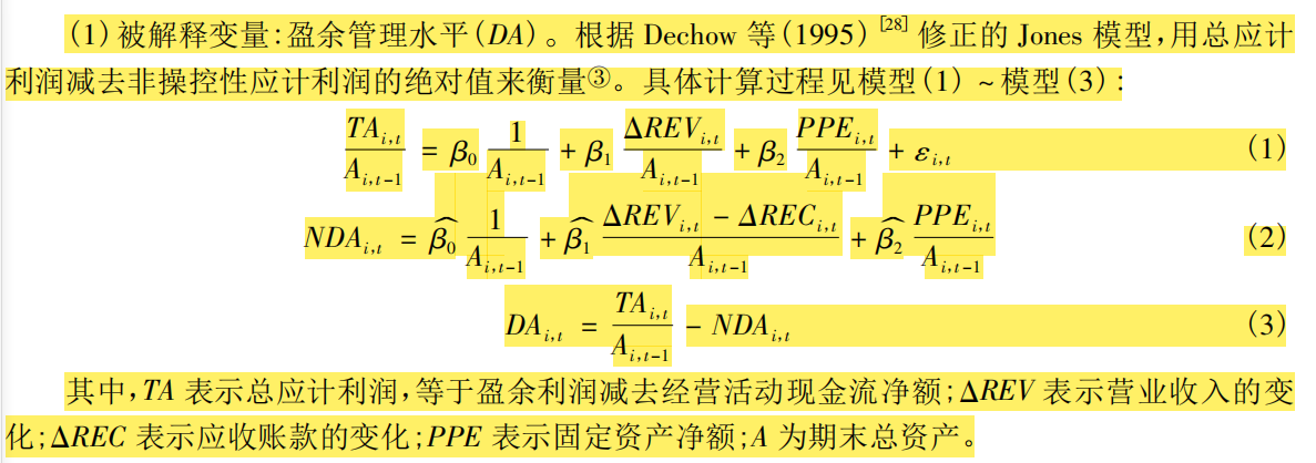 对(1) 式进行分行业分年份回归(删除分行业分年度观测数量小于10 个的观测) ,得到系数β1、β2和β3,将系数代入方程(2) 得到DA值