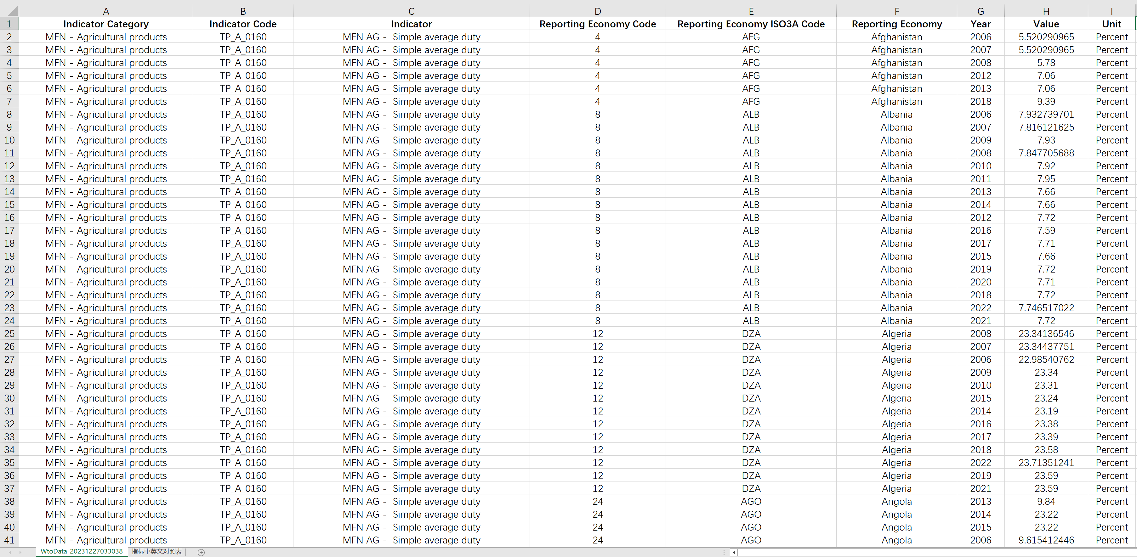 | MFN AG - Simple average duty | MFN AG - 简单平均关税(百分比) |