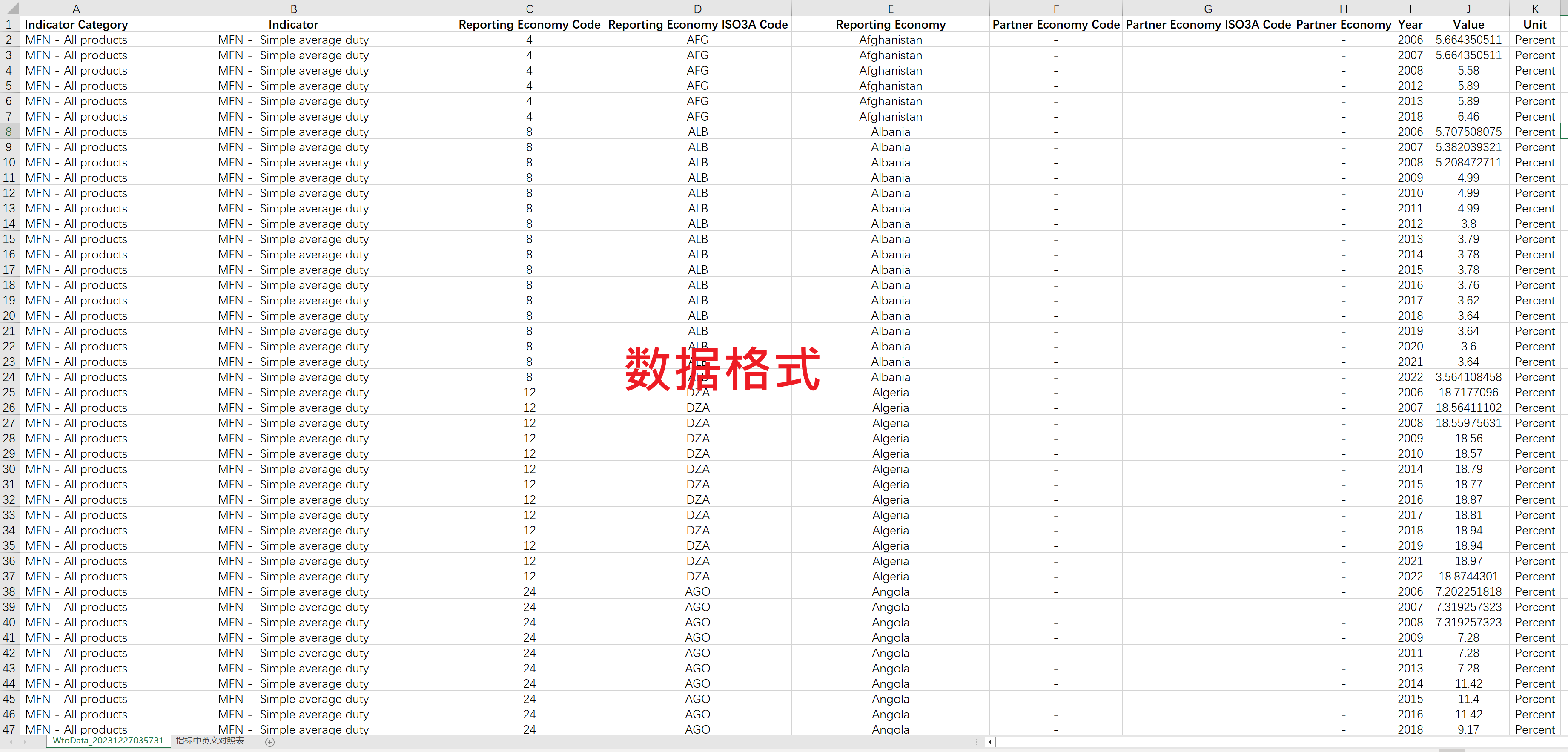| MFN - Simple average duty | 最惠国待遇 - 简单平均关税(百分比) |