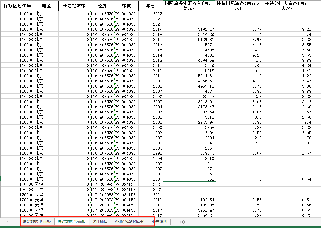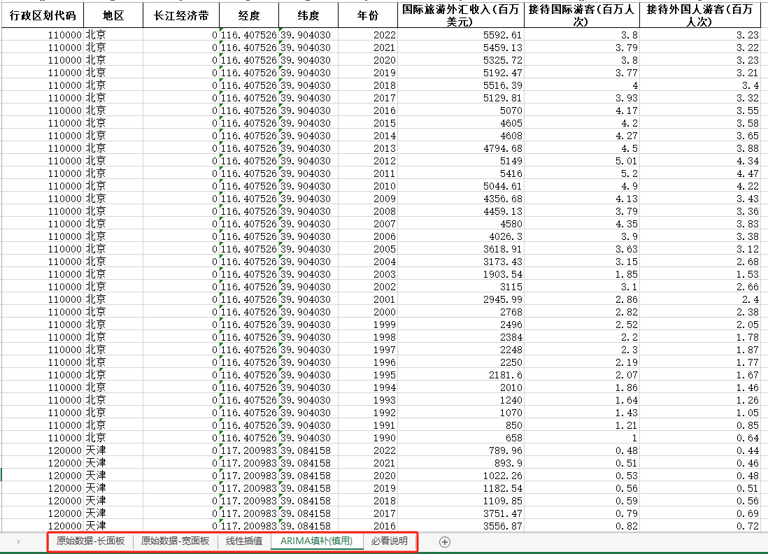 【省级】数据年度1990-2022年全国31省自治区直辖市省级面板数据-旅游业(长面板+宽面板含指标说明)ARIMA填补无缺失