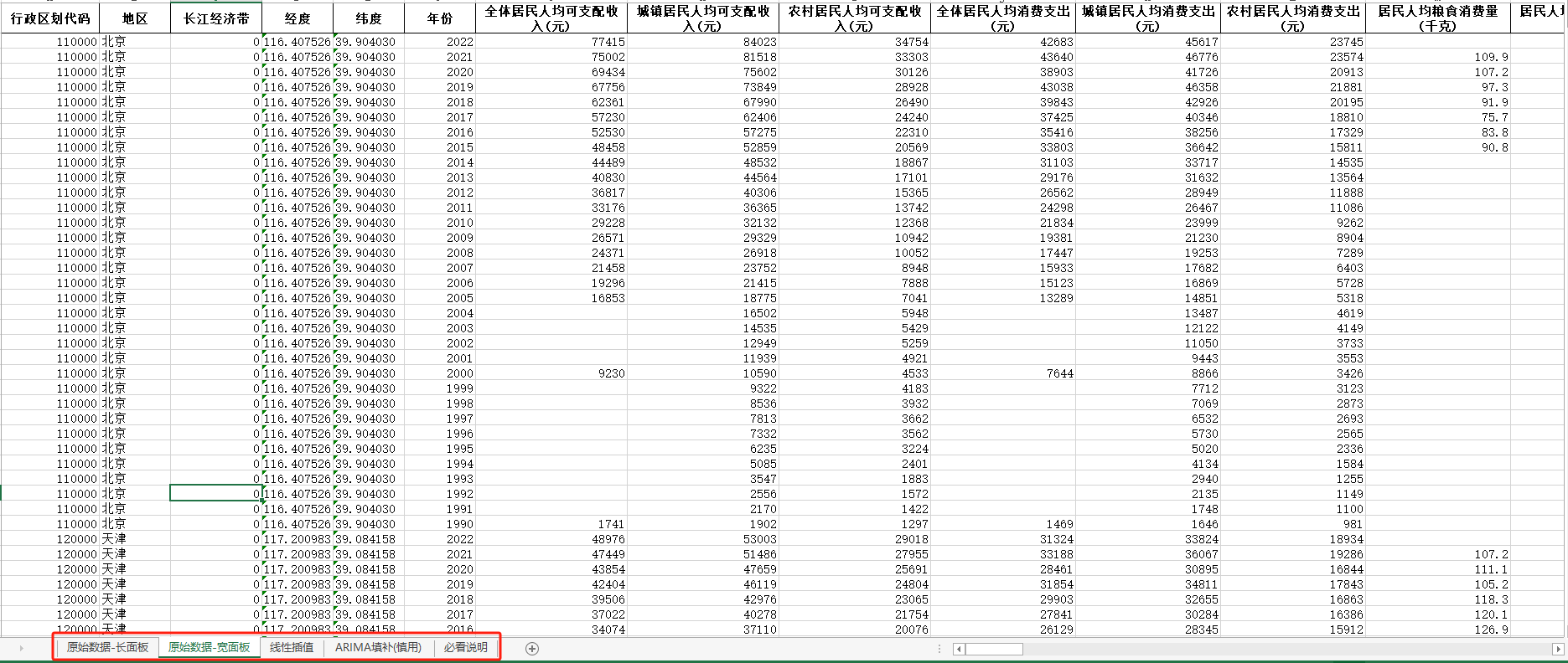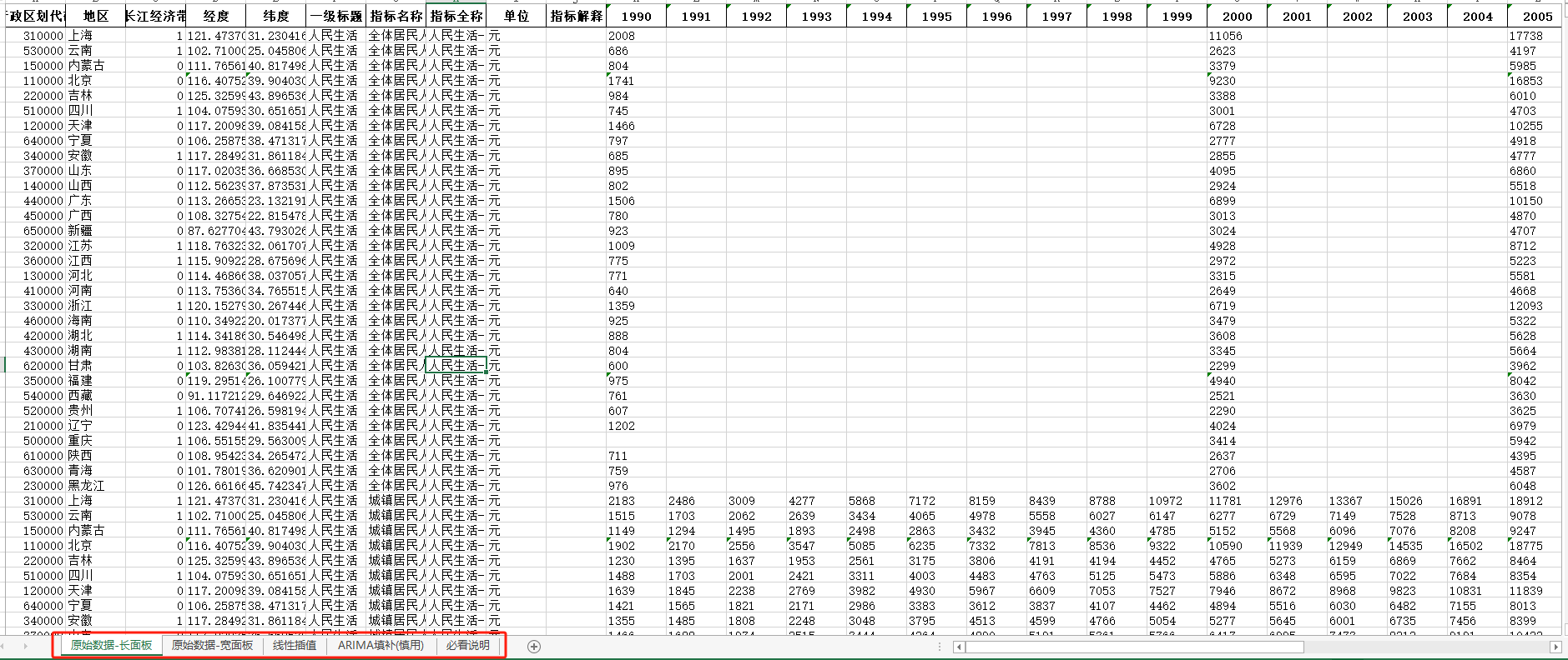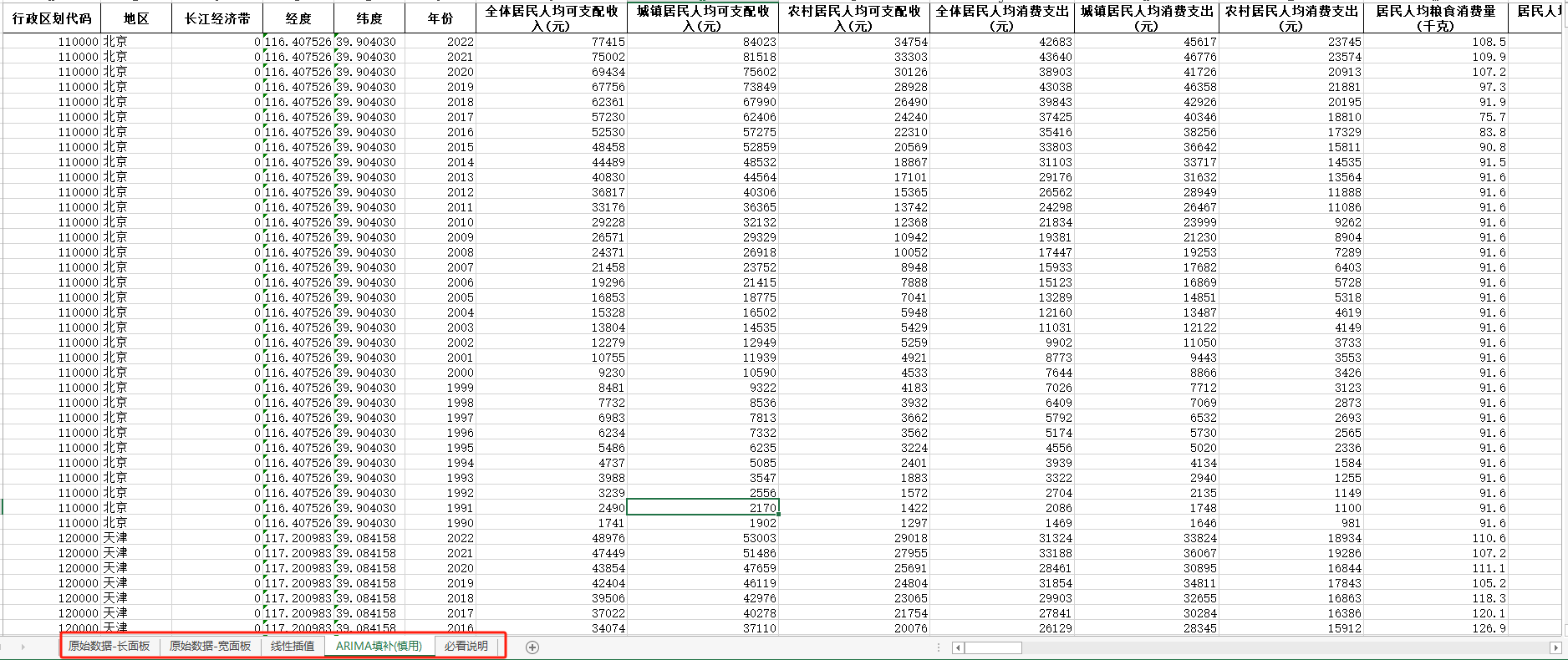【省级】数据年度1990-2022年全国31省自治区直辖市省级面板数据-人民生活(长面板+宽面板含指标说明)ARIMA填补无缺失