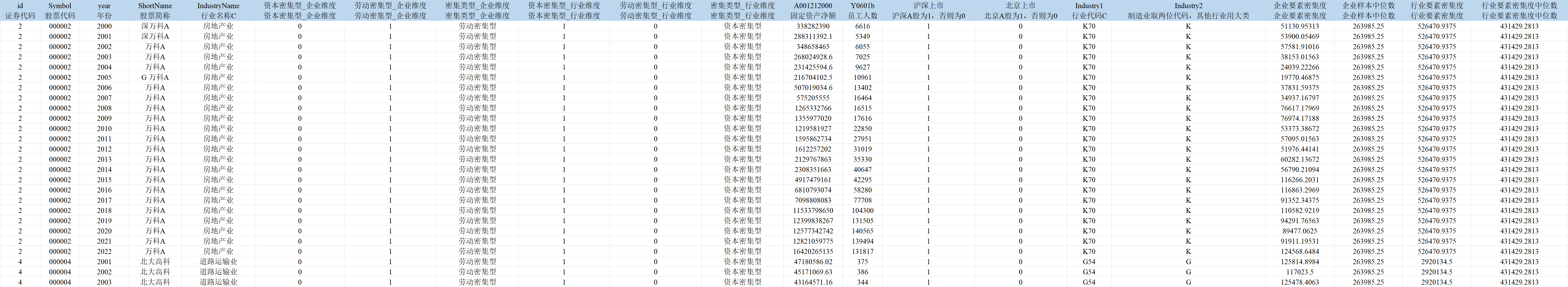 相关数据:证券代码、股票代码、年份、股票简称、行业名称C、资本密集型企业维度、劳动密集型企业维度、密集类型企业维度、资本密集型行业维度、劳动密集型行业维度、密集类型行业维度 固定资产净额、员工人数、沪深A股为1,否则为0、北京A股为1,否则为0、行业代码C、制造业取两位代码,其他行业用大类、企业要素密集度、企业样本中位数、行业要素密集度、行业要素密集度中位数