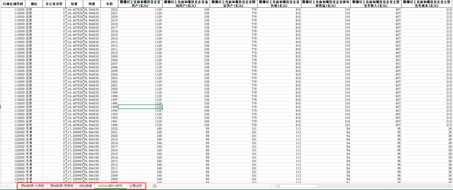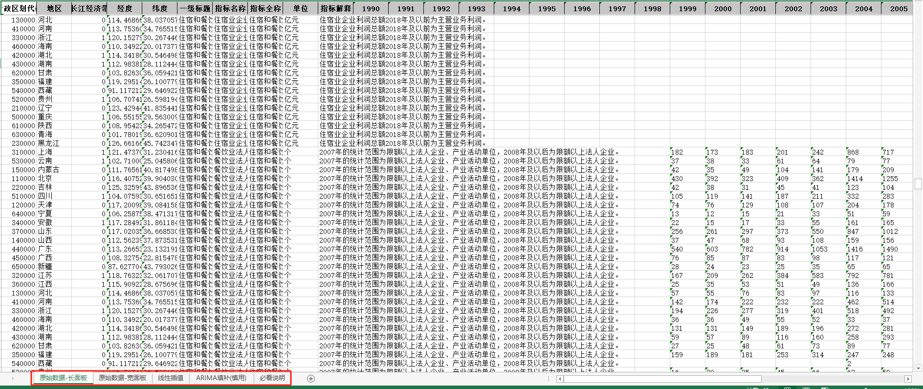 【省级】数据年度1990-2022年全国31省自治区直辖市省级面板数据-住宿和餐饮业(长面板+宽面板含指标说明)ARIMA填补无缺失