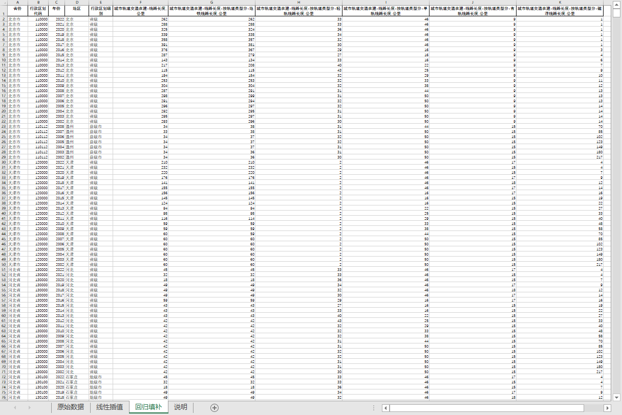 excel数据文件包原始数据(由于多年度指标不同存在缺失值)、线性插值、回归填补三个版本,提供您参考使用。