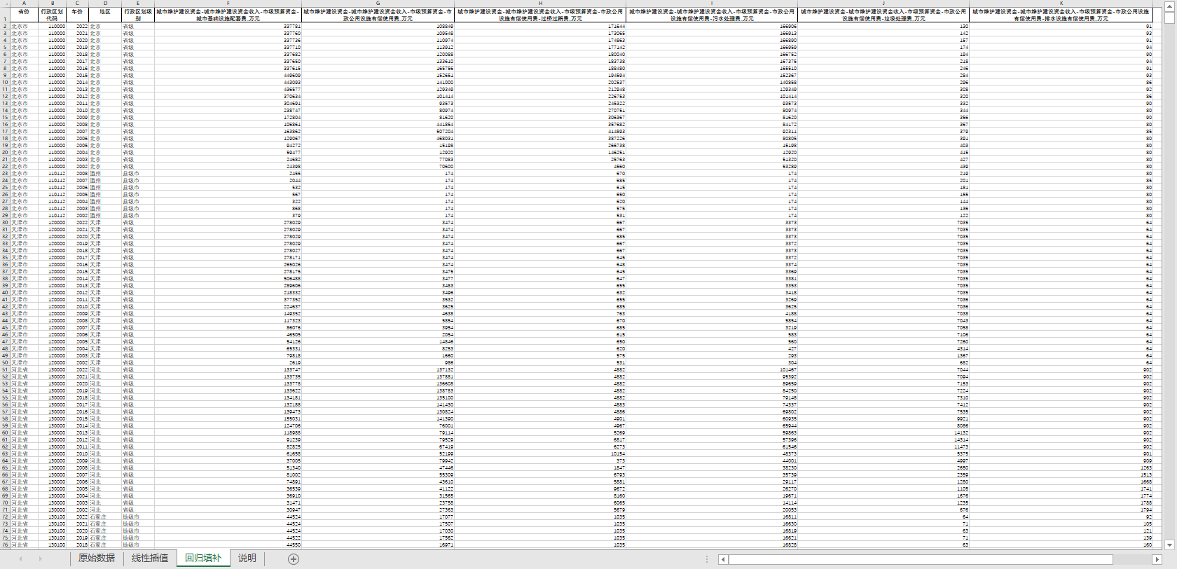 excel数据文件包原始数据(由于多年度指标不同存在缺失值)、线性插值、回归填补三个版本,提供您参考使用。