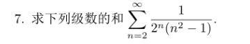 则\[f'(x)=\frac{1}{x(x-1)},f(x)=\ln \frac{x}{x-1},x>1.\]\[x=2,f(2)=\displaystyle\sum_{n=1}^{\infty}\frac{1}{n+2}2^{-n-2}=\ln2.\]\[\therefore \displaystyle\sum_{n=2}^{\infty}\frac{1}{2^n(n^2-1)}=\frac{1}{4}\ln2-\ln2=-\frac{3}{4}\ln2.\]