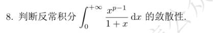 所以,由反常积分性质可知\[p<3, \int\limits_{0}^{+\infty}\frac{x^{p-1}}{1+x}< \infty,\]\[p\geqslant 3.\int\limits_{0}^{+\infty}\frac{x^{p-1}}{1+x}=\infty.\]