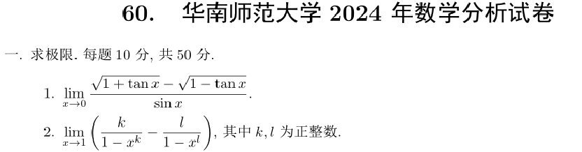 (1)、\[\lim_{x\to0}\frac{\sqrt{1+\tan x}-\sqrt{1-\tan x}}{\sin x}=\lim_{x\to0}\frac{2\tan x}{\sin x(\sqrt{1+\tan x}+\sqrt{1-\tan x})}=\lim_{x\to0}\frac{1}{\cos x}=1.\]