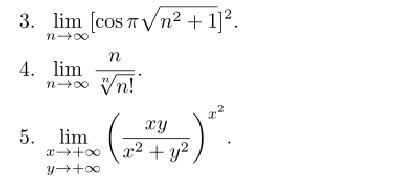 3、\[\lim_{n\to\infty}[\cos\pi\sqrt{n^2+1}]^2=\lim_{n\to\infty}[\cos n\pi\sqrt{1+\frac{1}{n^2}}]^2=1.\]      4、\[\lim_{n\to\infty}\frac{n}{\sqrt[n]{n!}}=\lim_{n\to\infty}\sqrt[n]{\frac{n^n}{n!}}=\lim_{n\to\infty}e^{-\displaystyle\frac{1}{n}\sum_{k=1}^{n}\ln\frac{k}{n}}=e^{-\displaystyle\int_{0}^{1}\ln xdx}=e^{\displaystyle(x-x\ln x)|_0^1}=e.\]