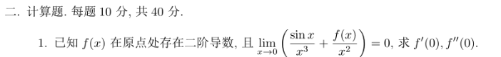 同理\[\lim_{x\to0}(\frac{-\sin x+2f'(x)+xf''(x)}{6x})=0,\]\[\Rightarrow -\sin x+2f'(x)+xf''(x)=o(x^2),f''(0)=1.\]