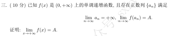 再者。\[\because \lim_{n\to\infty}f(a_n)=A,\therefore \forall \varepsilon > 0,\]\[\exists N_1> 0,n> N_1,s.t.|f(a_{N_1})-A|< \frac{\varepsilon }{2}.\]又由函数的单调性和上面的结论,就得到\[A-\frac{\varepsilon }{2}< f(a_{N_1})<A+ \frac{\varepsilon }{2}.\]当\[x> a_{N_1},A-\frac{\varepsilon }{2}< f(a_{N_1})\le f(x)\le A,\rightarrow |f(x)-f(a_N)|< \frac{\varepsilon }{2}.\]