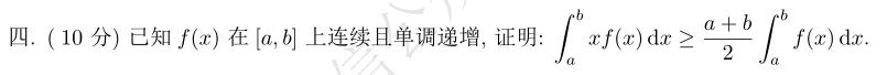 由已知条件,函数在所给区间上单调增,所以\[\forall x\in[a,b],(x-\frac{a+b}{2})(f(x)-f(\frac{a+b}{2}))\geqslant 0.\]\[\because \int_{a}^{b}(x-\frac{a+b}{2})f(\frac{a+b}{2})dx=f(\frac{a+b}{2})\int_{a}^{b}(x-\frac{a+b}{2})dx=0.\]\[\begin{align*}\therefore \int_{a}^{b}(x-\frac{a+b}{2})f(x)dx