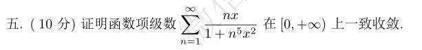 \[\because |\frac{nx}{1+n^5x^2}|<|\frac{nx}{1+n^5x}|<|\frac{nx}{n^5x}| =\frac{1}{n^4}=0,(n\to\infty)\]而\[\displaystyle\sum_{n=1}^{\infty}\frac{1}{n^4}< \infty.\]