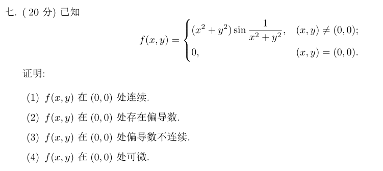 (1)、\[\because f(0,y)=\frac{2y^4}{y^2}=2y^2\to 0,(x,y)\rightarrow (0,0),\]\[f(x,0)=\frac{x^3}{x^2}=x\rightarrow 0,(x,y)\rightarrow (0,0),\]\[y=kx,(k\ne 0),f(x,y)=\frac{x^3(1+k+k^2+2k^4x)}{x^2(1+k^2)}=\frac{x(1+k+k^2+2k^4x)}{1+k^2}\rightarrow 0,(x,y)\rightarrow (0,0),\]\[\therefore \lim_{x,y\to0}f(x,y)=f(0,0).\]