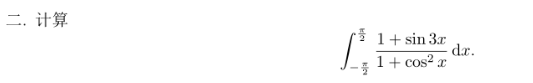 &=\int_{-\frac{\pi}{2}}^{\frac{\pi}{2}}\frac{1}{1+\cos^2x}dx+\int_{-\frac{\pi}{2}}^{\frac{\pi}{2}}\frac{\sin3x}{1+\cos^2x}dx \\