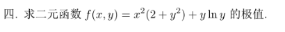 可以将其看作两部分\[f_1(x,y)=x^2(2+y^2)\geqslant 0.\Rightarrow f_{1\min }=0.\]\[f_2(x,y)=y\ln y,f'_2(x,y)=\ln y+1=0,y=e^{-1},f''_2(x,y)=\frac{1}{y}=e> 0,\Rightarrow f_{2\min }=-\frac{1}{e}.\]因此有极小值\[f(x,y)=f_1(x,y)+f_2(x,y)\geqslant -\frac{1}{e}.\]