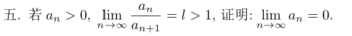 于是有\[a_{n+1}<(\frac{1}{l}+\varepsilon )a_n< (\frac{1}{l}+\varepsilon )^2a_{n-1}< \cdots < (\frac{1}{l}+\varepsilon )^{n+1}a_1=0.(n\to\infty) \]